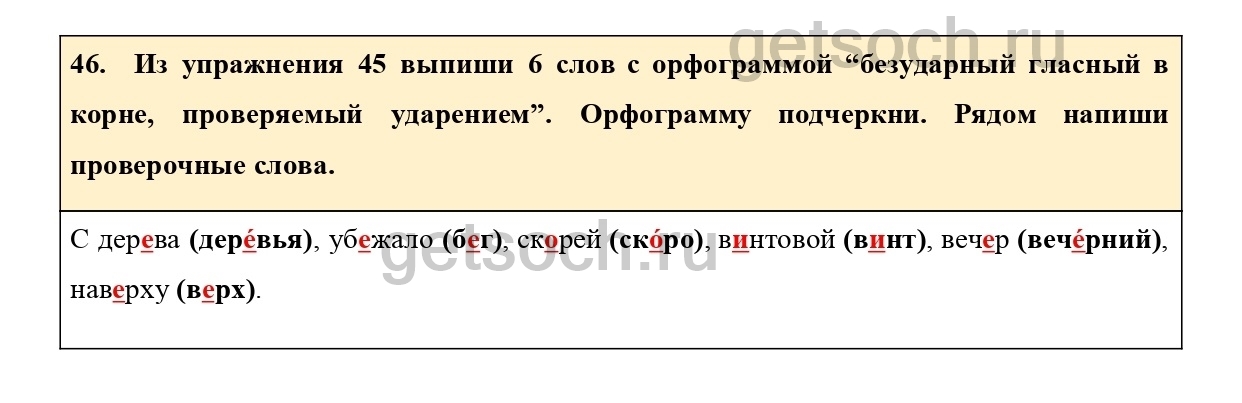 46. Из упражнения 45 выпиши 6 слов с орфограммой “безударный гласный в корне, проверяемый ударением”. Орфограмму подчеркни. Рядом напиши проверочные слова.
