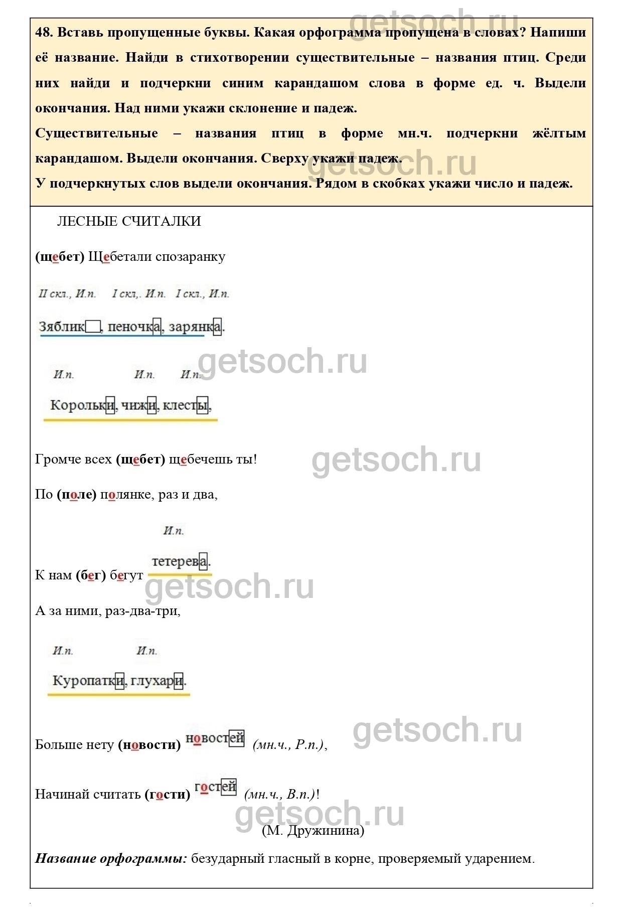 48. Вставь пропущенные буквы. Какая орфограмма пропущена в словах? Напиши её название. Найди в стихотворении существительные – названия птиц. Среди них найди и подчеркни синим карандашом слова в форме ед. ч. Выдели окончания. Над ними укажи склонение и падеж.