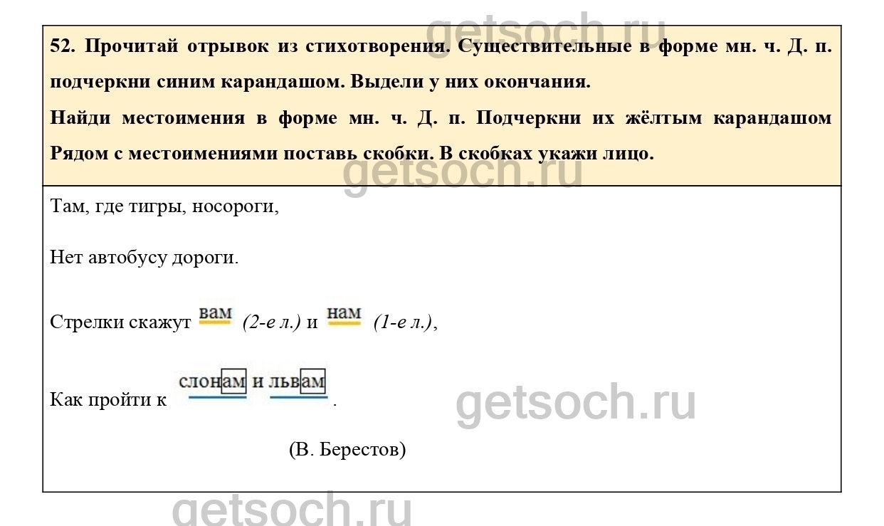 52. Прочитай отрывок из стихотворения. Существительные в форме мн. ч. Д. п. подчеркни синим карандашом. Выдели у них окончания.