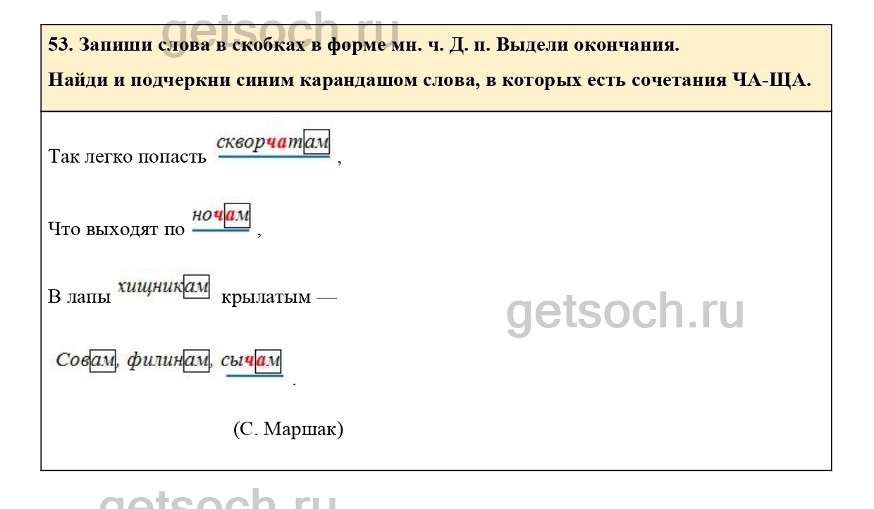 Рассмотрим ответы на Упражнение 53 из тетради для самостоятельной работы по русскому языку для 3 класса Байковой