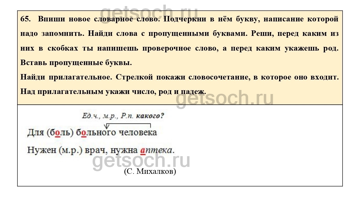 65. Впиши новое словарное слово. Подчеркни в нём букву, написание которой надо запомнить. Найди слова с пропущенными буквами. Реши, перед каким из них в скобках ты напишешь проверочное слово, а перед каким укажешь род. Вставь пропущенные буквы.