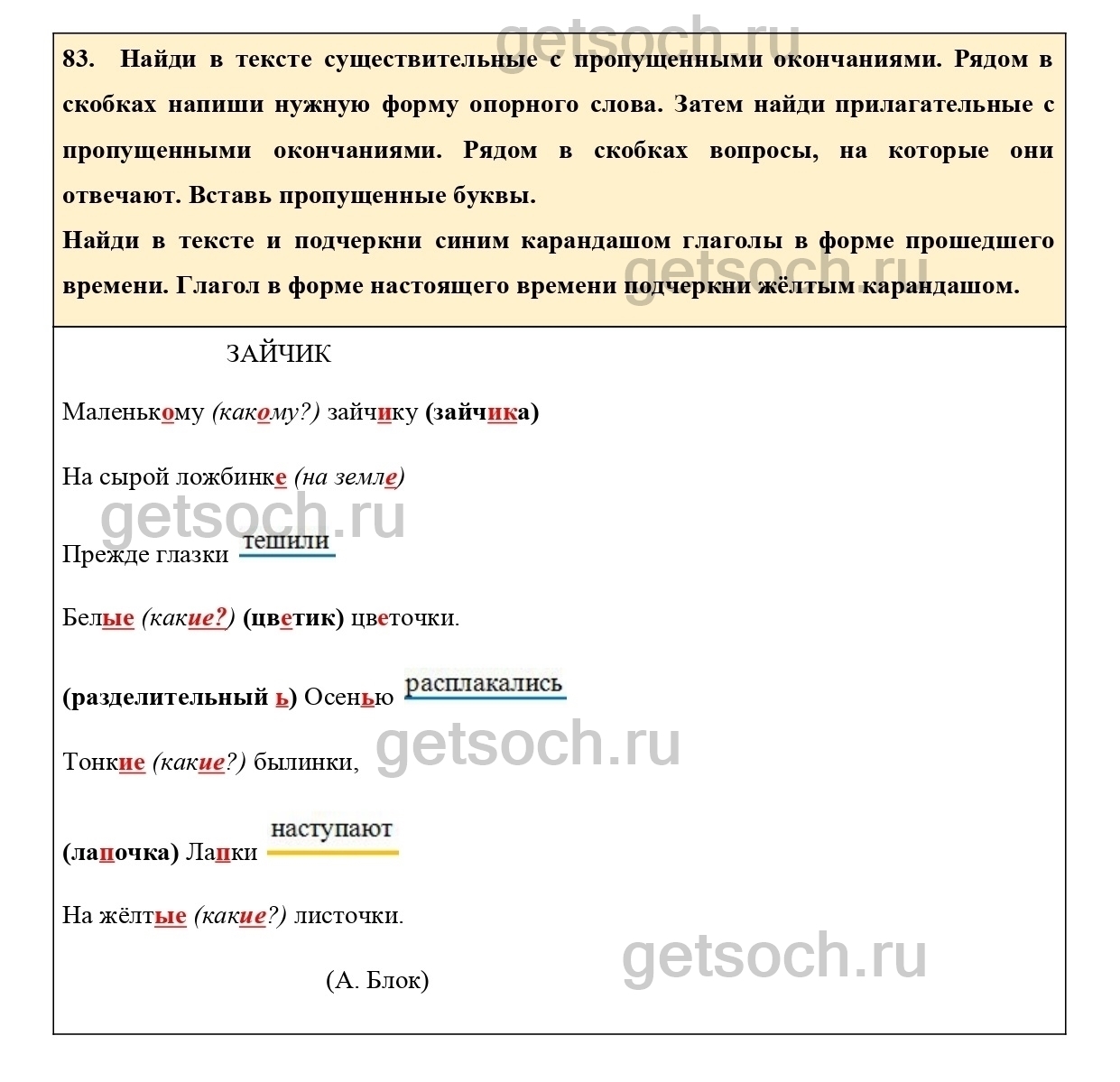 83. Найди в тексте существительные с пропущенными окончаниями. Рядом в скобках напиши нужную форму опорного слова. Затем найди прилагательные с пропущенными окончаниями. Рядом в скобках вопросы, на которые они отвечают. Вставь пропущенные буквы.