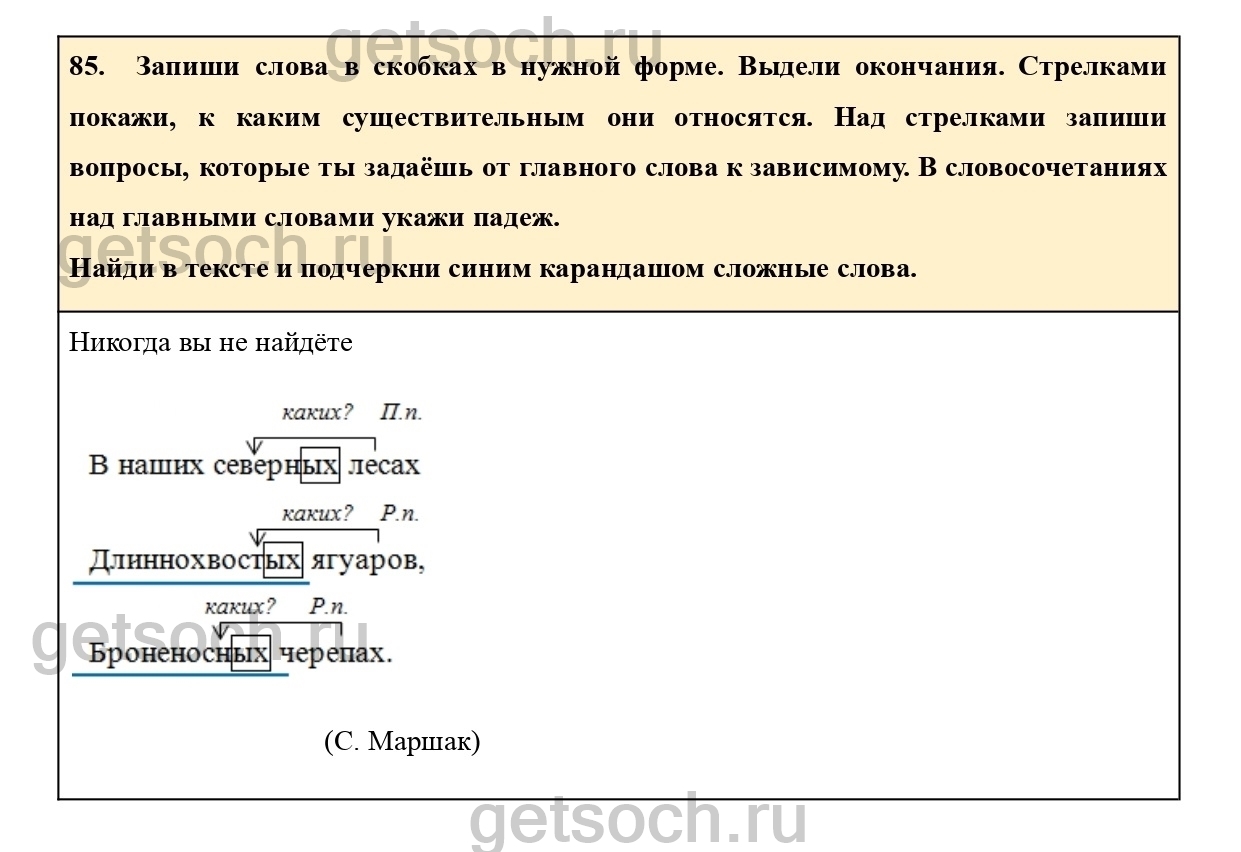 85. Запиши слова в скобках в нужной форме. Выдели окончания. Стрелками покажи, к каким существительным они относятся. Над стрелками запиши вопросы, которые ты задаёшь от главного слова к зависимому. В словосочетаниях над главными словами укажи падеж.
