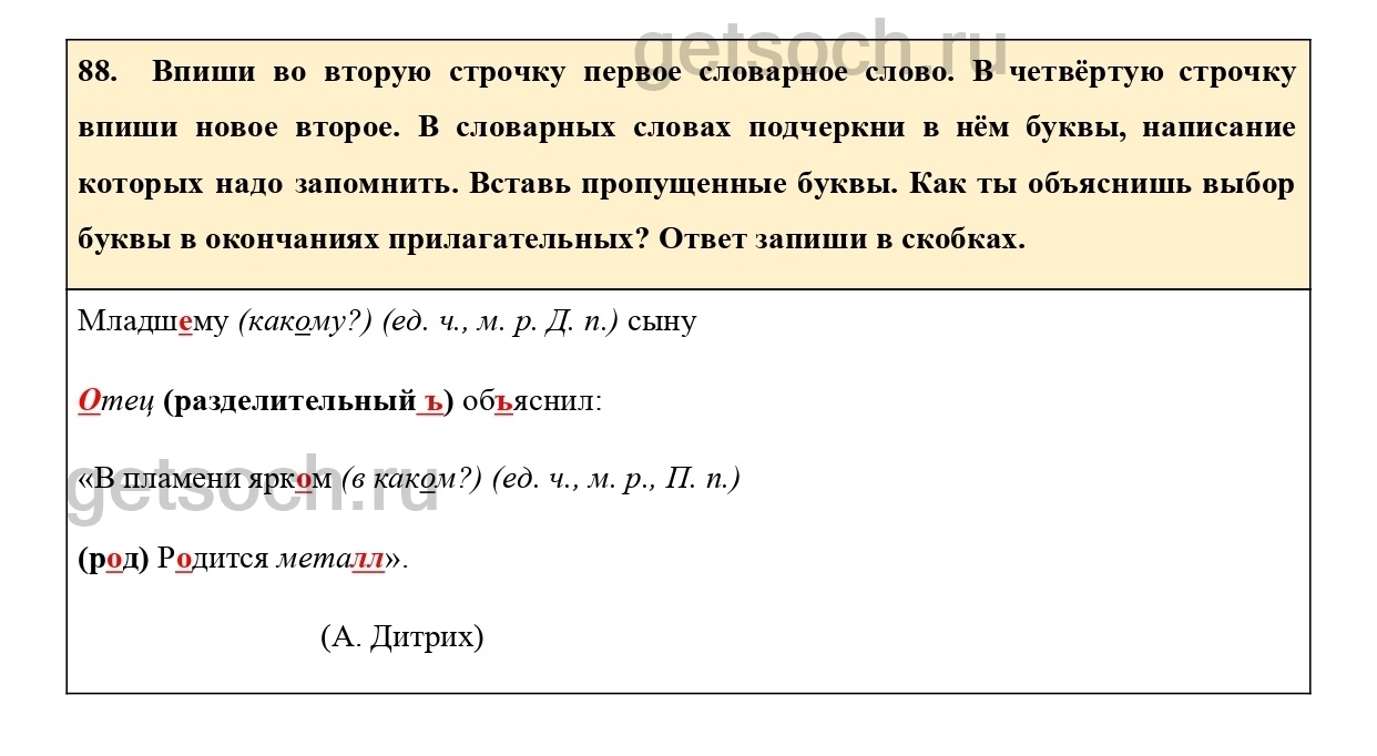 Рассмотрим ответы на Упражнение 88 из тетради для самостоятельной работы по русскому языку для 3 класса Байковой