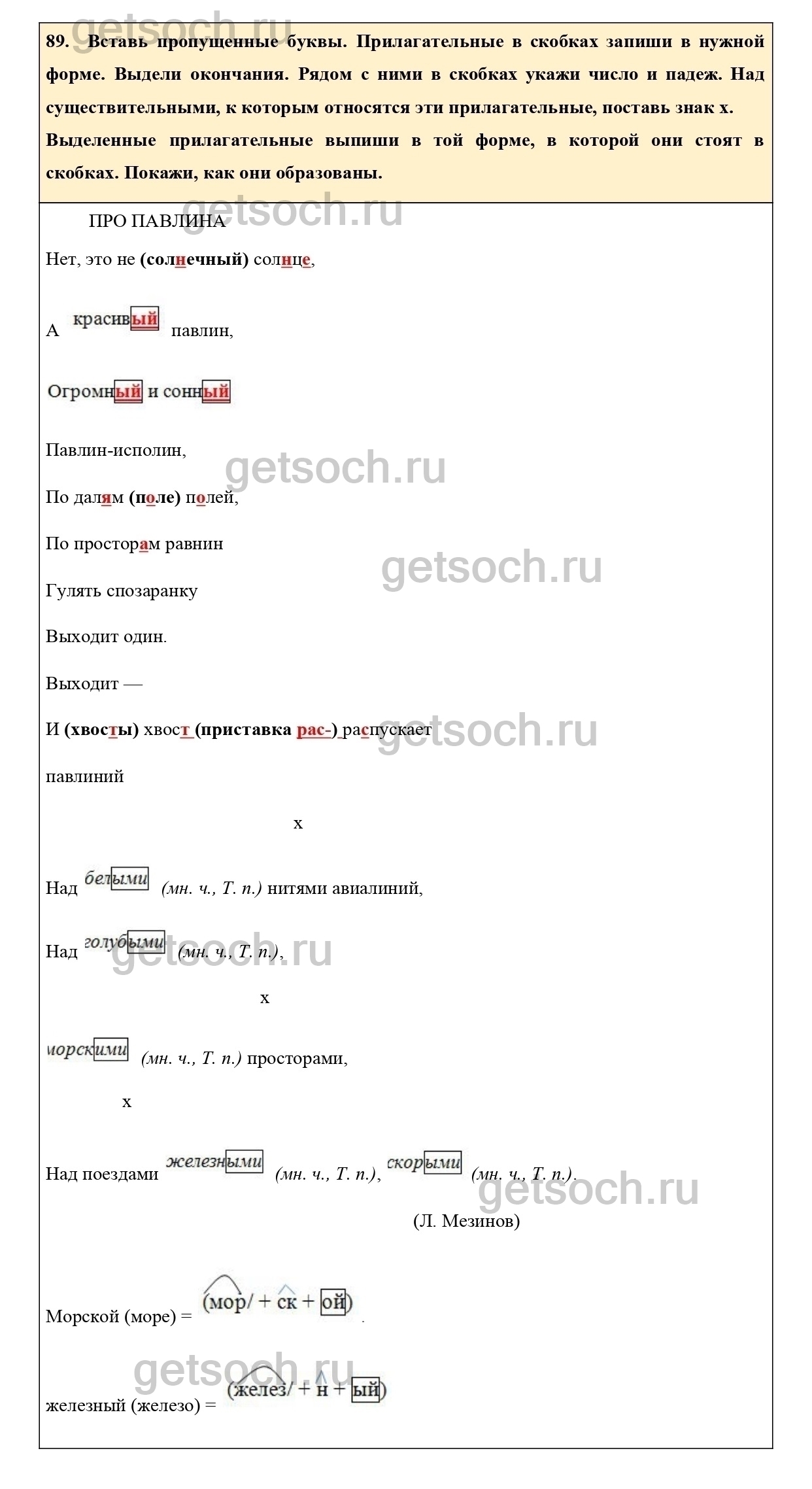 89. Вставь пропущенные буквы. Прилагательные в скобках запиши в нужной форме. Выдели окончания. Рядом с ними в скобках укажи число и падеж. Над существительными, к которым относятся эти прилагательные, поставь знак х.