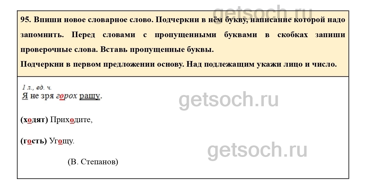 95. Впиши новое словарное слово. Подчеркни в нём букву, написание которой надо запомнить. Перед словами с пропущенными буквами в скобках запиши проверочные слова. Вставь пропущенные буквы.