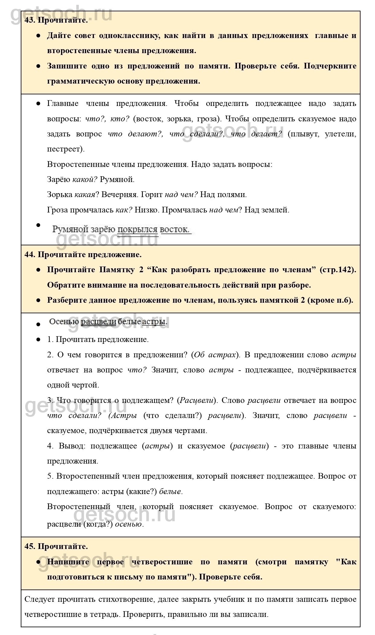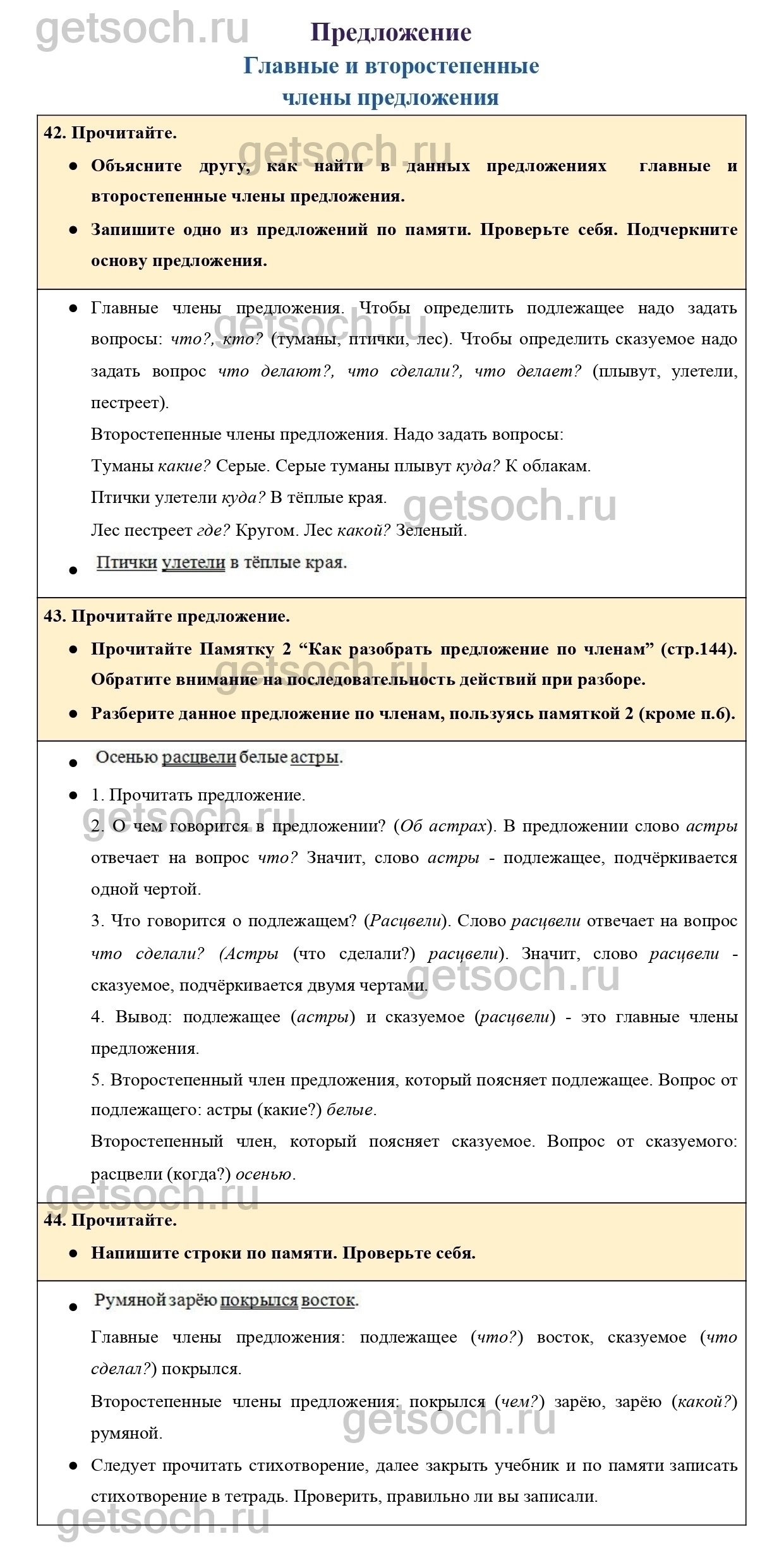 Прочитайте Памятку 2 “Как разобрать предложение по членам” (стр.144). Обратите внимание на последовательность действий при разборе.