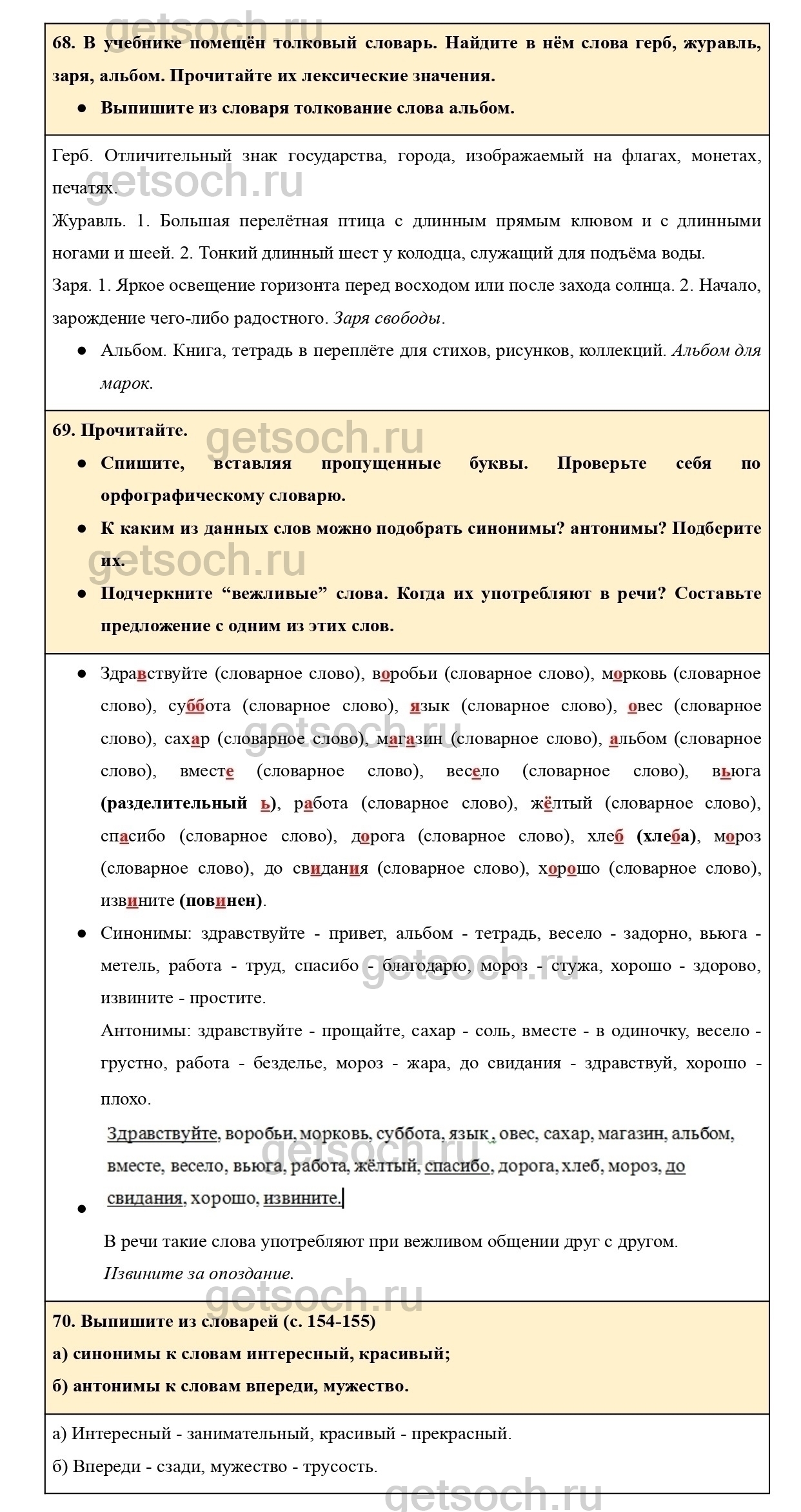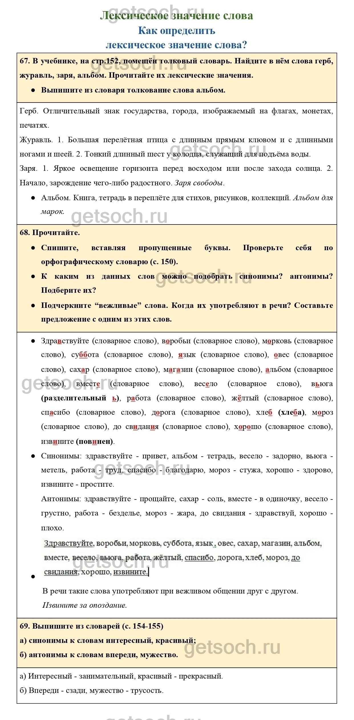 67. В учебнике, на стр.152, помещён толковый словарь. Найдите в нём слова герб, журавль, заря, альбом. Прочитайте их лексические значения.