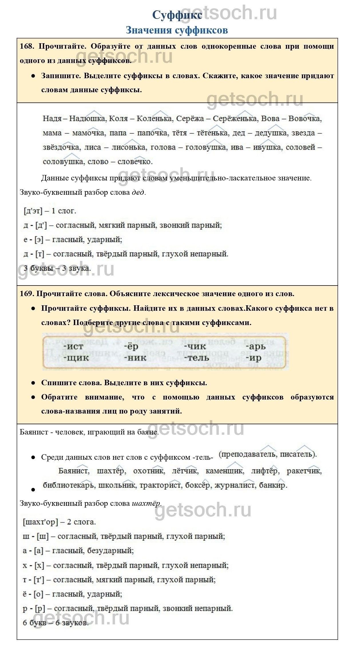 168. Прочитайте. Образуйте от данных слов однокоренные слова при помощи одного из данных суффиксов.