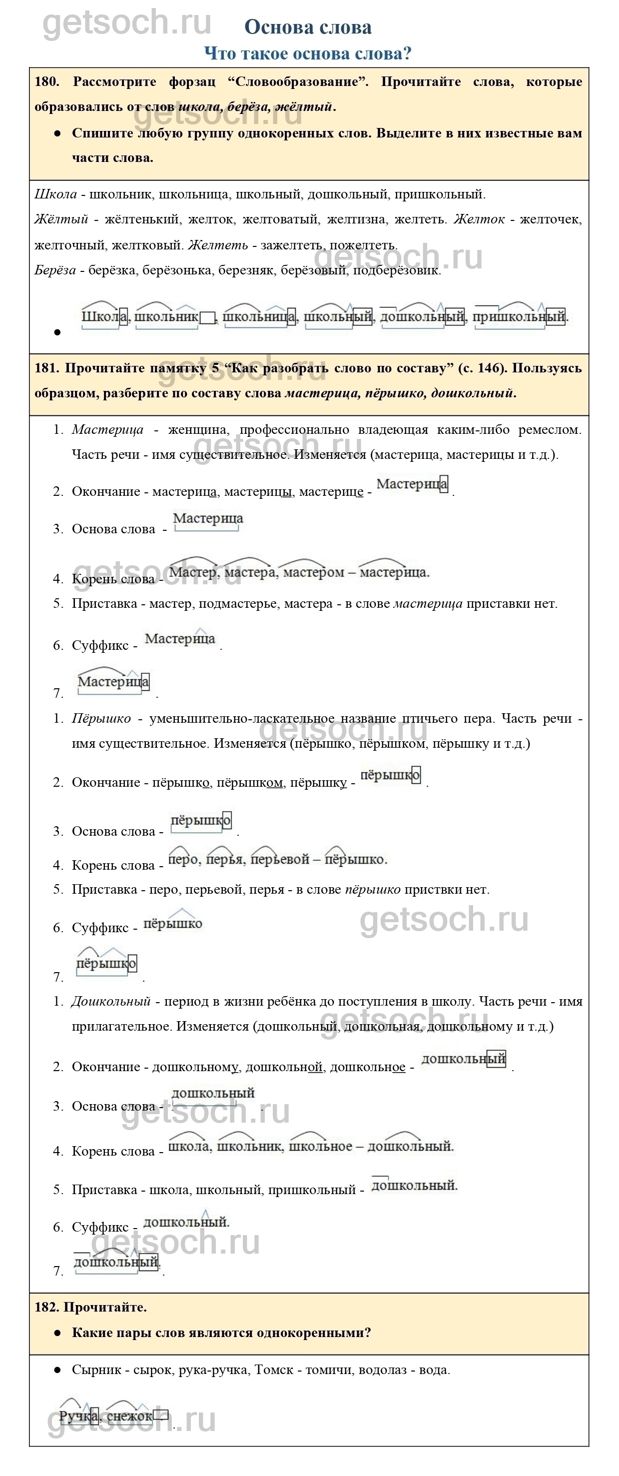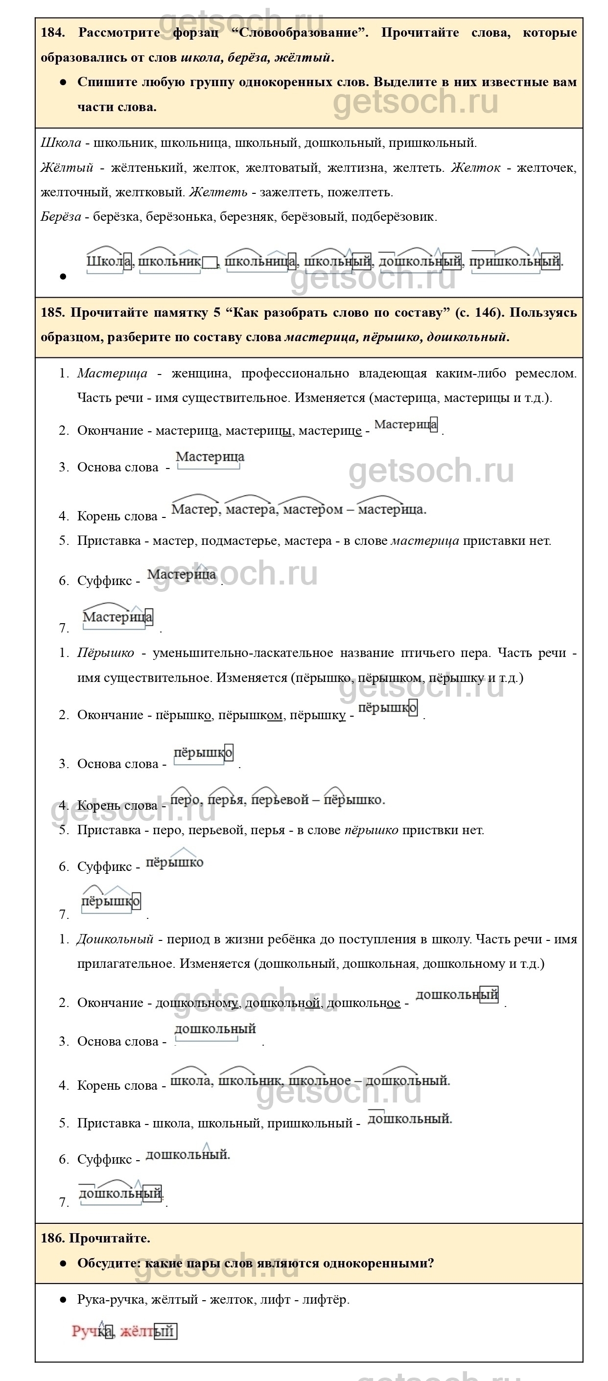 181. Прочитайте памятку 5 “Как разобрать слово по составу” (с. 146). Пользуясь образцом, разберите по составу слова мастерица, пёрышко, дошкольный.