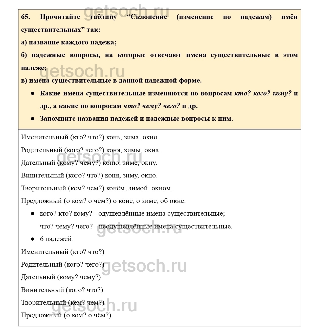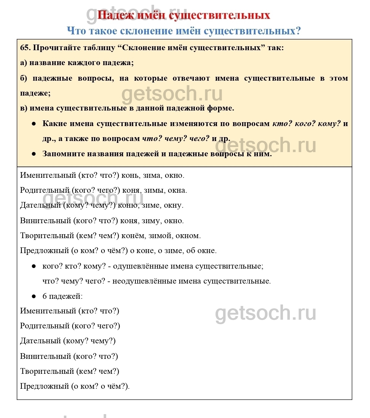 65. Прочитайте таблицу “Склонение имён существительных” так:
