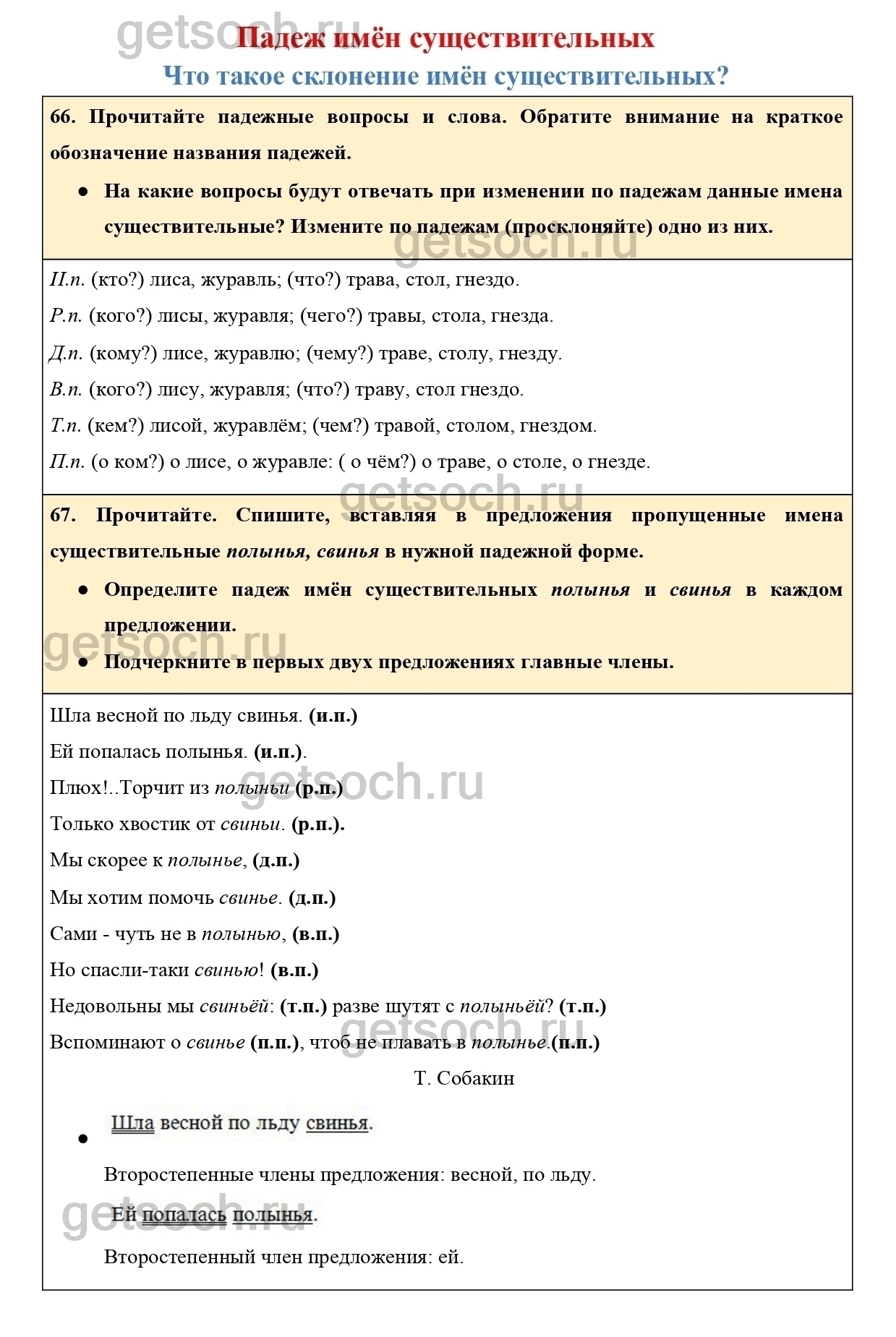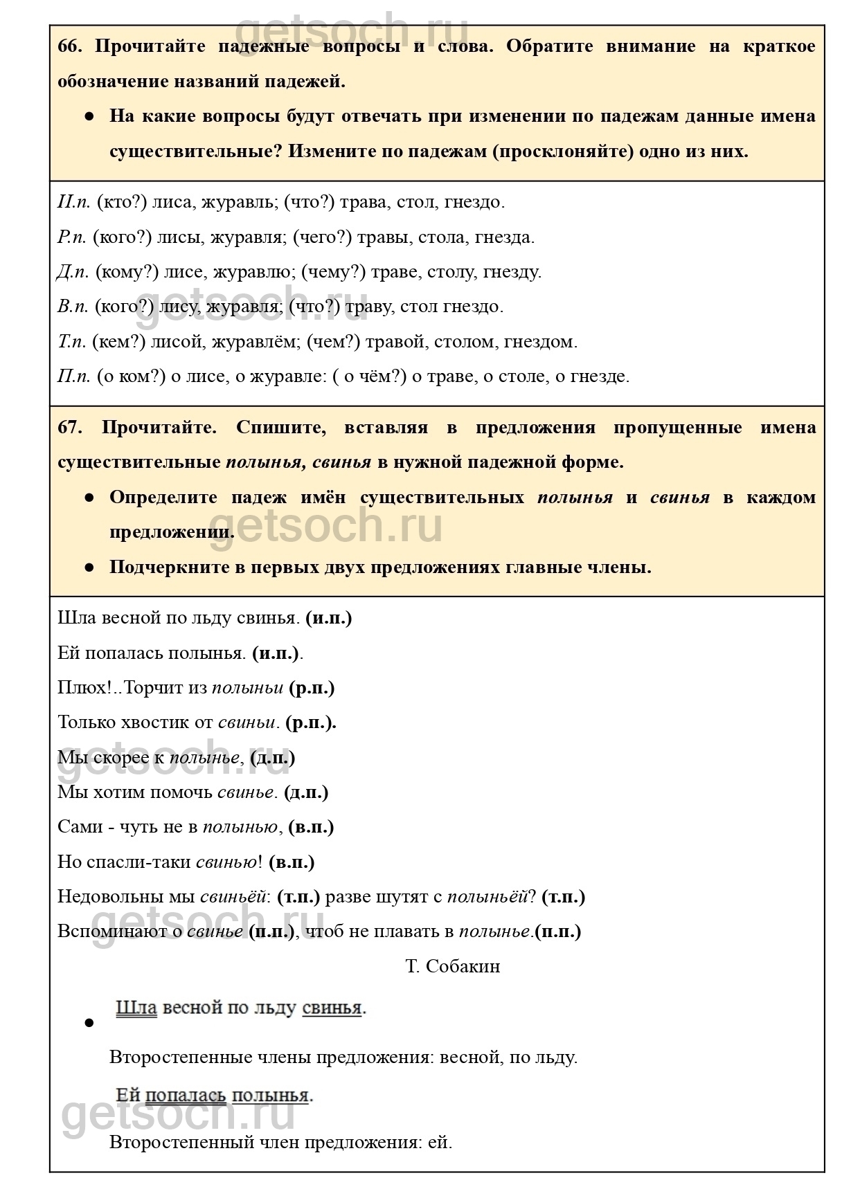 67. Прочитайте. Спишите, вставляя в предложения пропущенные имена существительные полынья, свинья в нужной падежной форме.