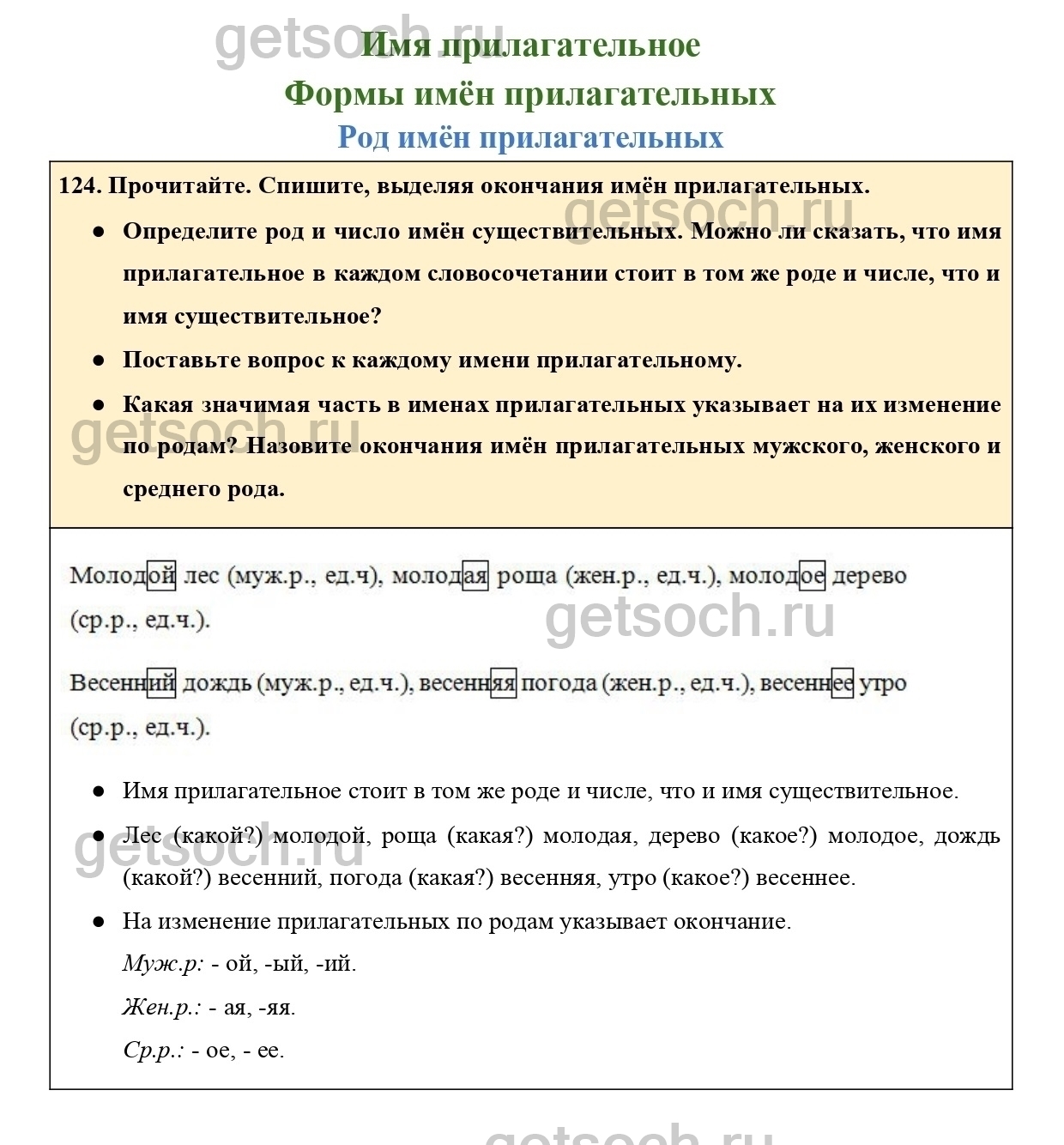 124. Прочитайте. Спишите, выделяя окончания имён прилагательных.