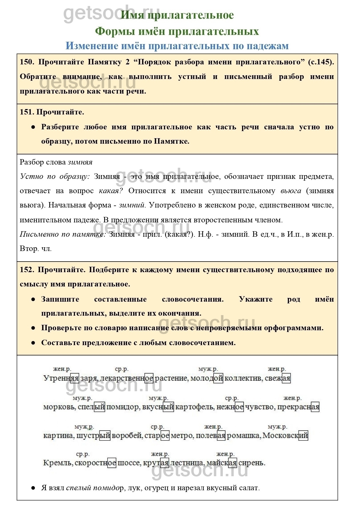 150. Прочитайте Памятку 2 “Порядок разбора имени прилагательного” (с.145). Обратите внимание, как выполнить устный и письменный разбор имени прилагательного как части речи.