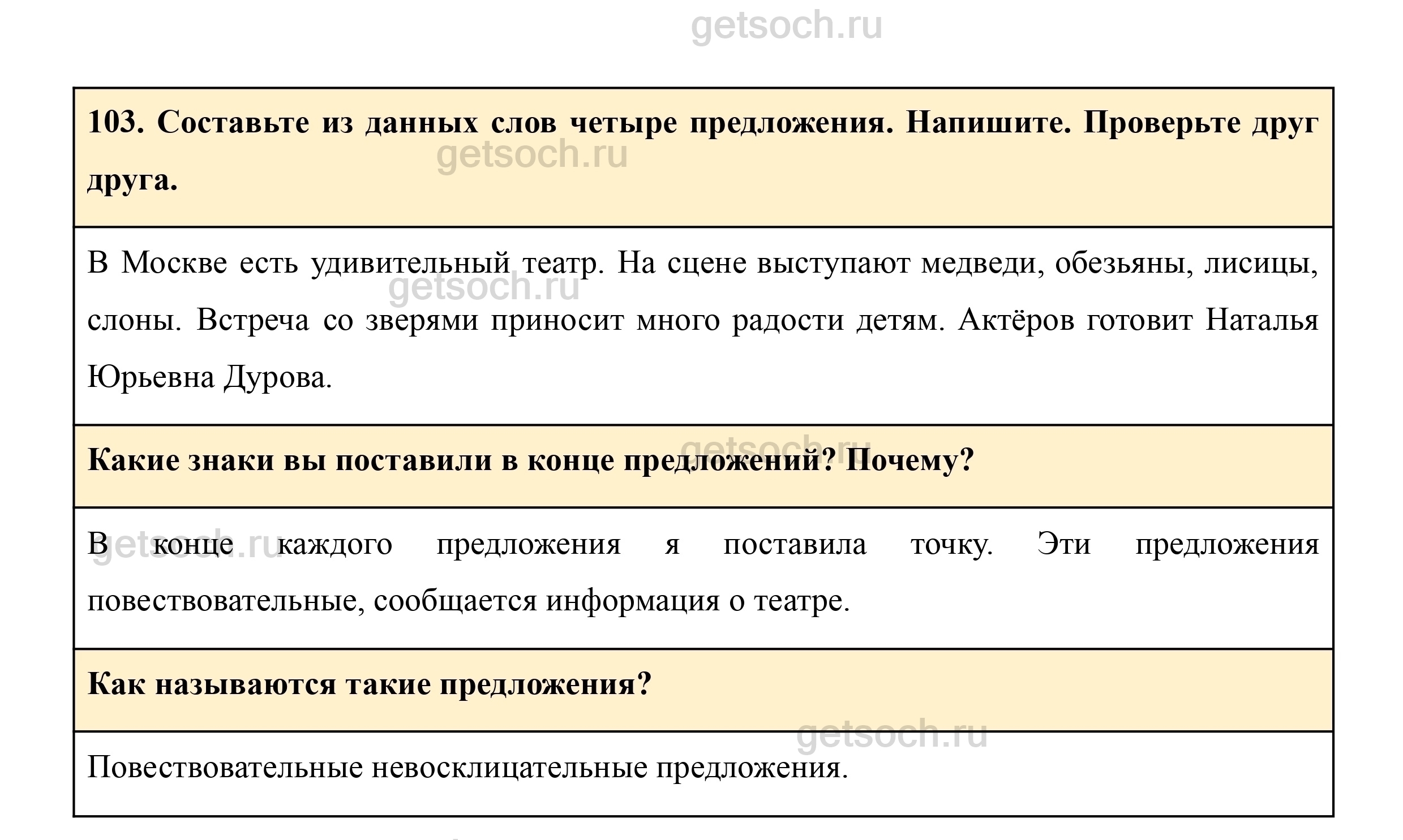 103. Составьте из данных слов четыре предложения. Напишите. Проверьте друг друга.