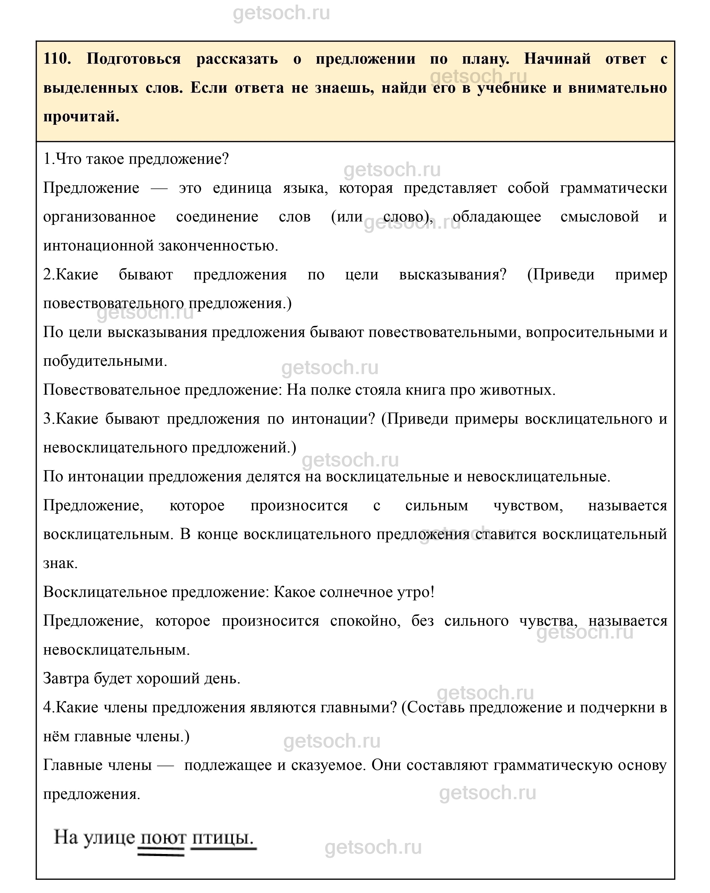110. Подготовься рассказать о предложении по плану. Начинай ответ с выделенных слов. Если ответа не знаешь, найди его в учебнике и внимательно прочитай.