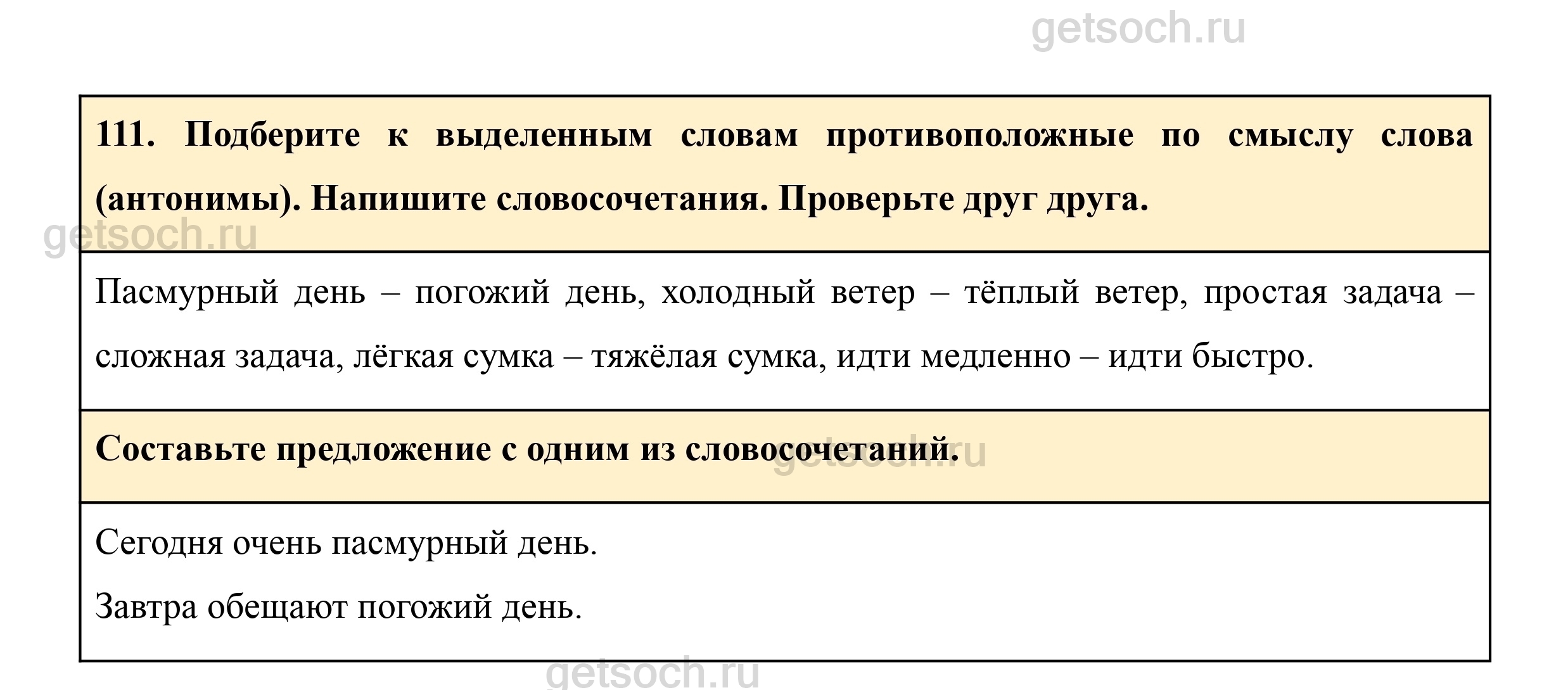 111. Подберите к выделенным словам противоположные по смыслу слова (антонимы). Напишите словосочетания. Проверьте друг друга.