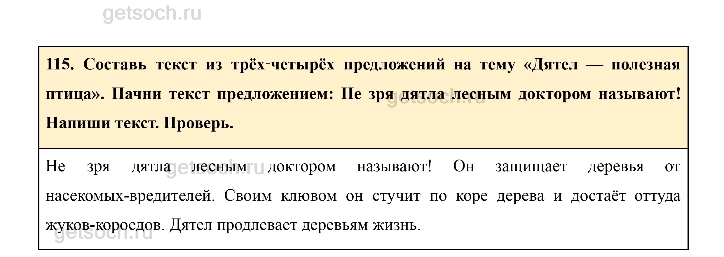 115. Составь текст из трёх‑четырёх предложений на тему «Дятел — полезная птица». Начни текст предложением: Не зря дятла лесным доктором называют! Напиши текст. Проверь.