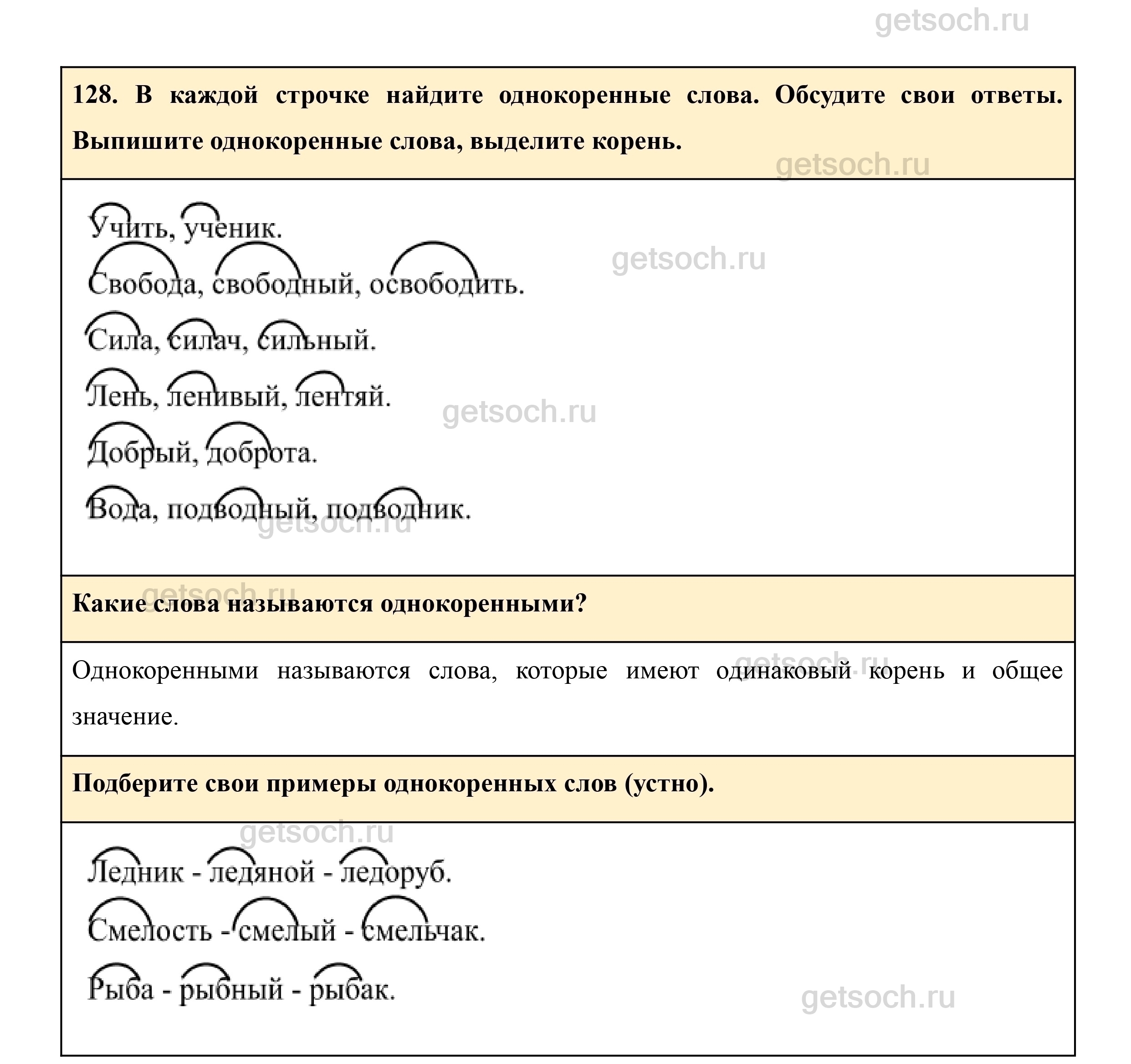 128. В каждой строчке найдите однокоренные слова. Обсудите свои ответы. Выпишите однокоренные слова, выделите корень.