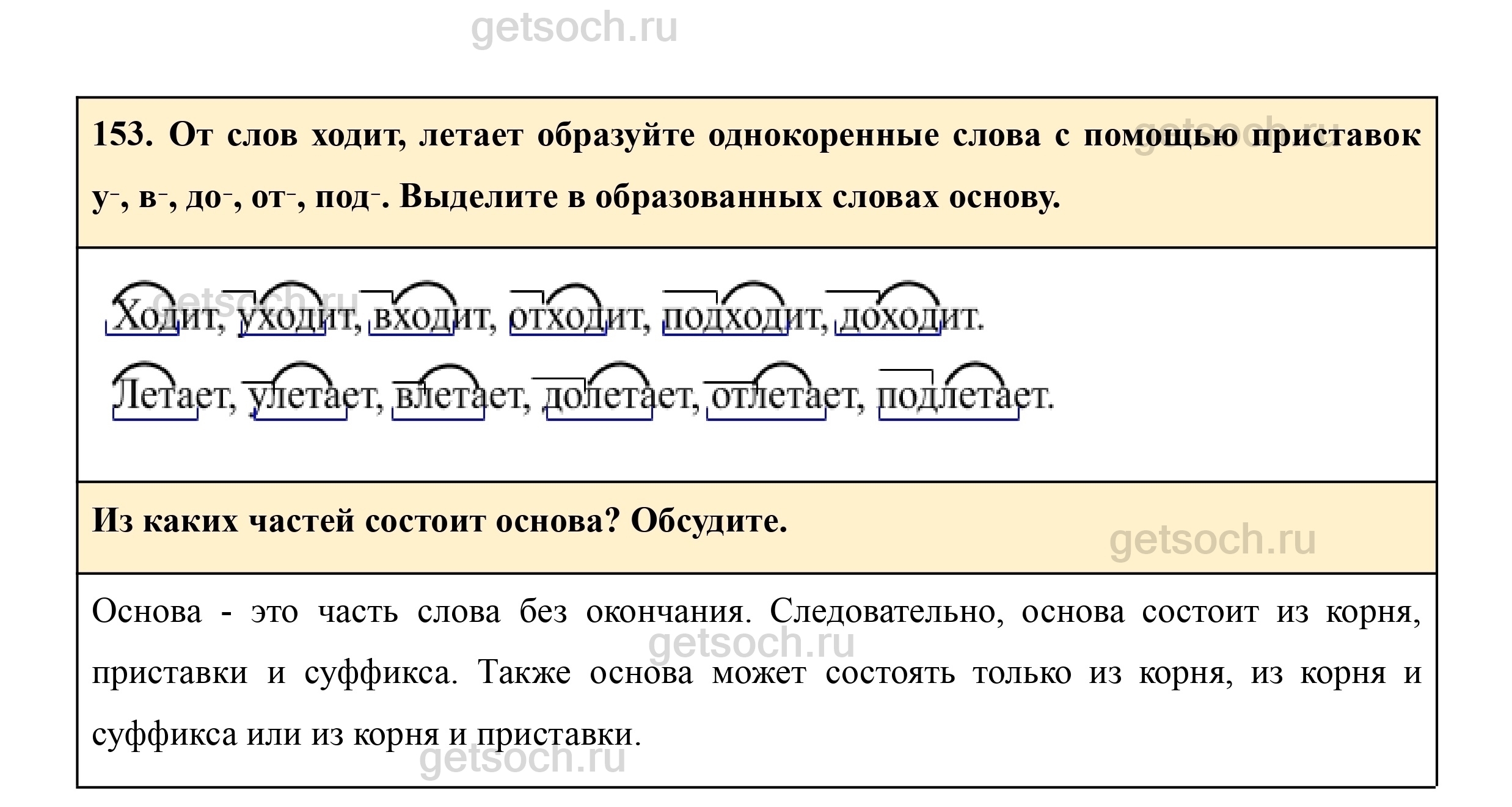 153. От слов ходит, летает образуйте однокоренные слова с помощью приставок у‑, в‑, до‑, от‑, под‑. Выделите в образованных словах основу.