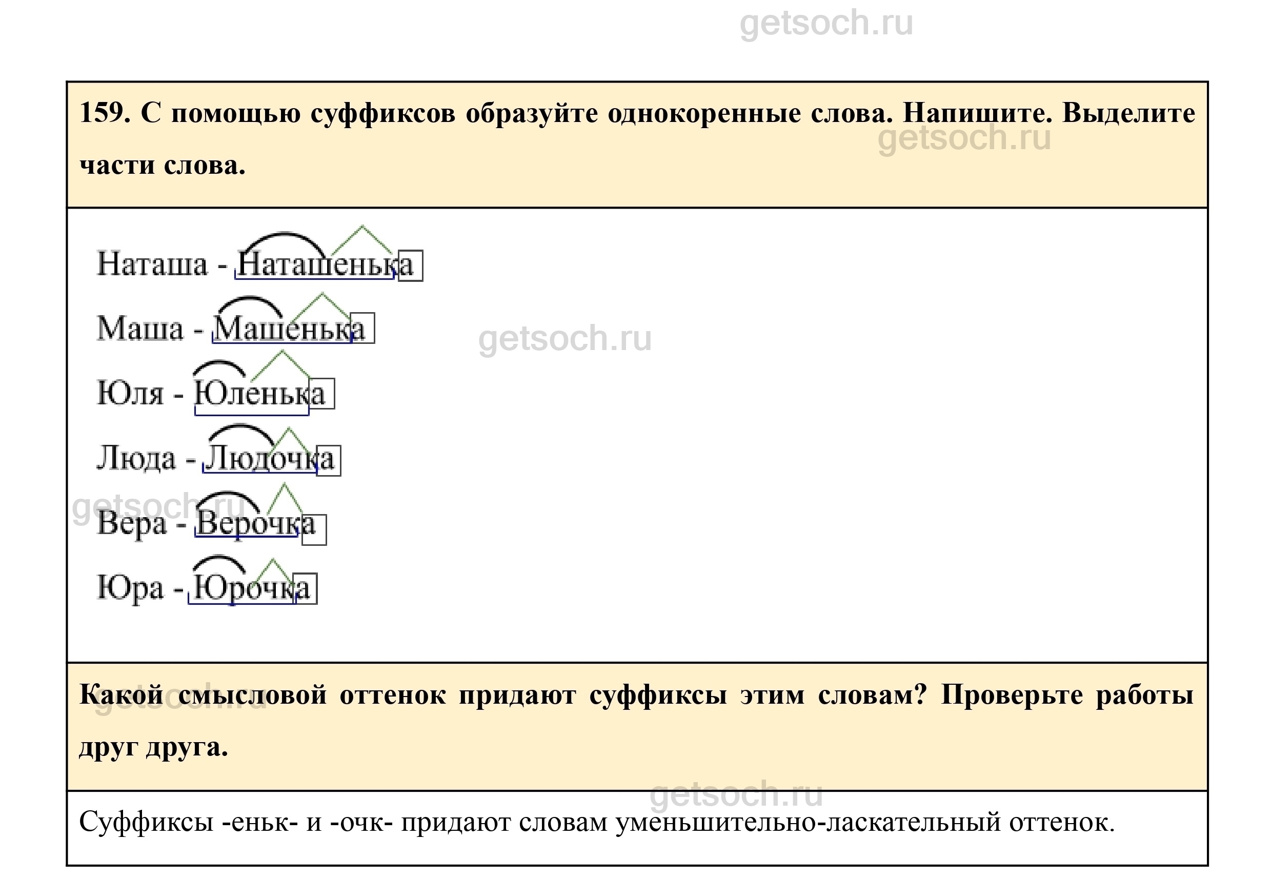 159. С помощью суффиксов образуйте однокоренные слова. Напишите. Выделите части слова.