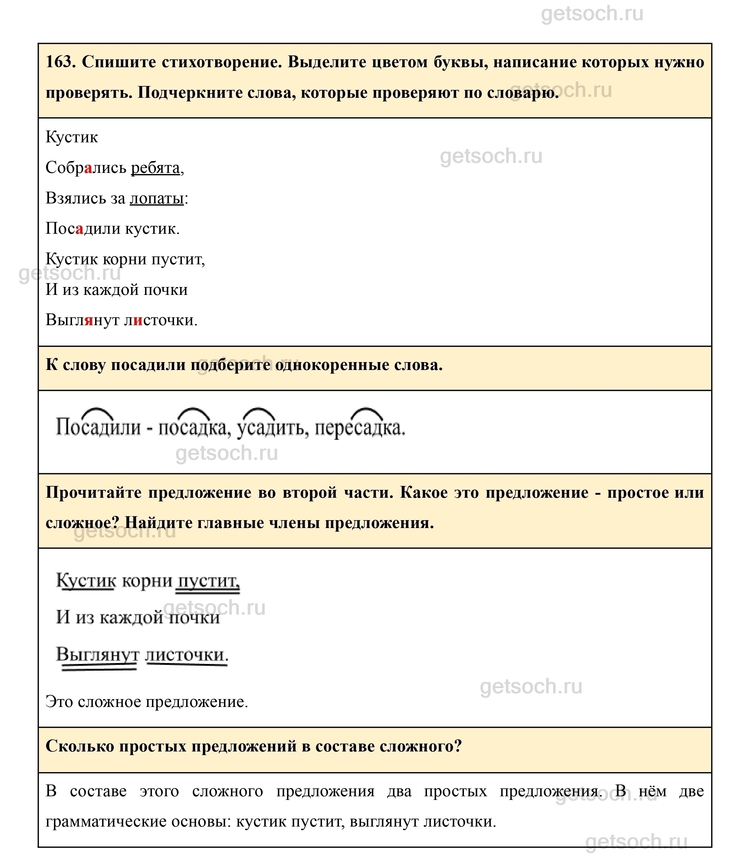 163. Спишите стихотворение. Выделите цветом буквы, написание которых нужно проверять. Подчеркните слова, которые проверяют по словарю.