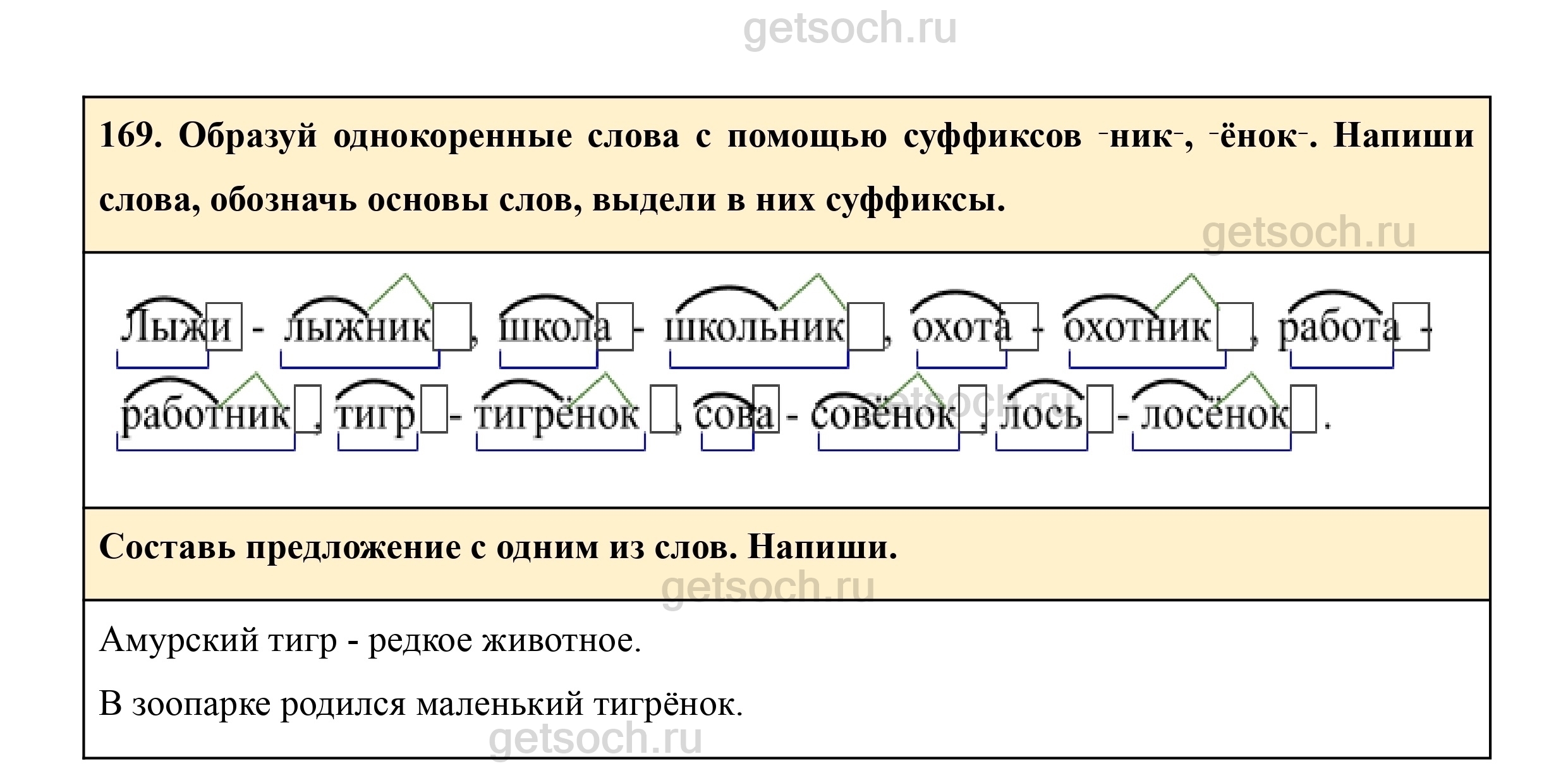 169. Образуй однокоренные слова с помощью суффиксов ‑ник‑, ‑ёнок‑. Напиши слова, обозначь основы слов, выдели в них суффиксы.