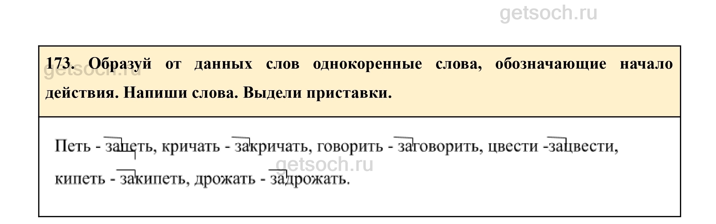 173. Образуй от данных слов однокоренные слова, обозначающие начало действия. Напиши слова. Выдели приставки.