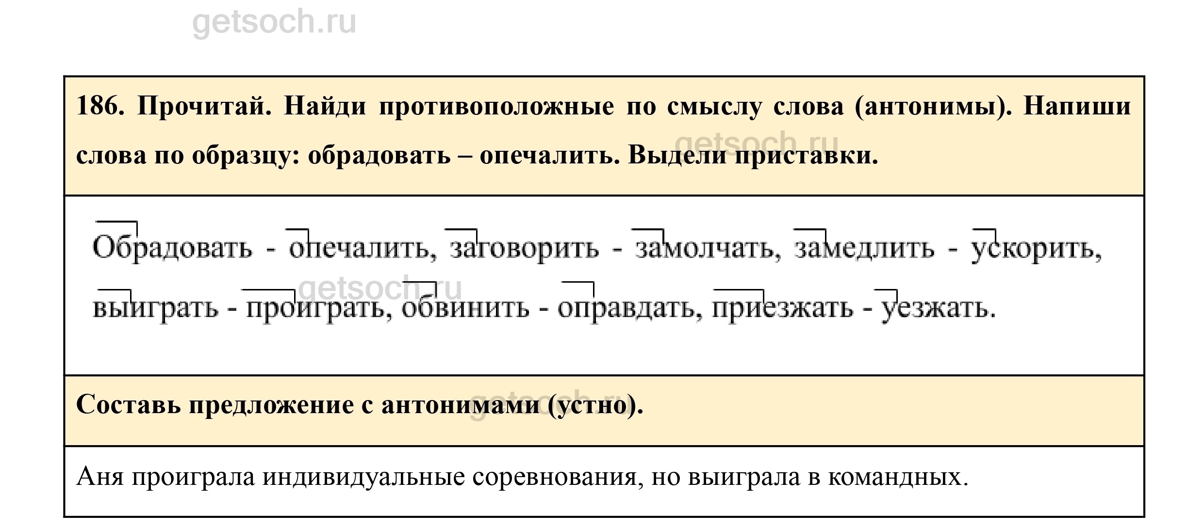 186. Прочитай. Найди противоположные по смыслу слова (антонимы). Напиши слова по образцу: обрадовать – опечалить. Выдели приставки.