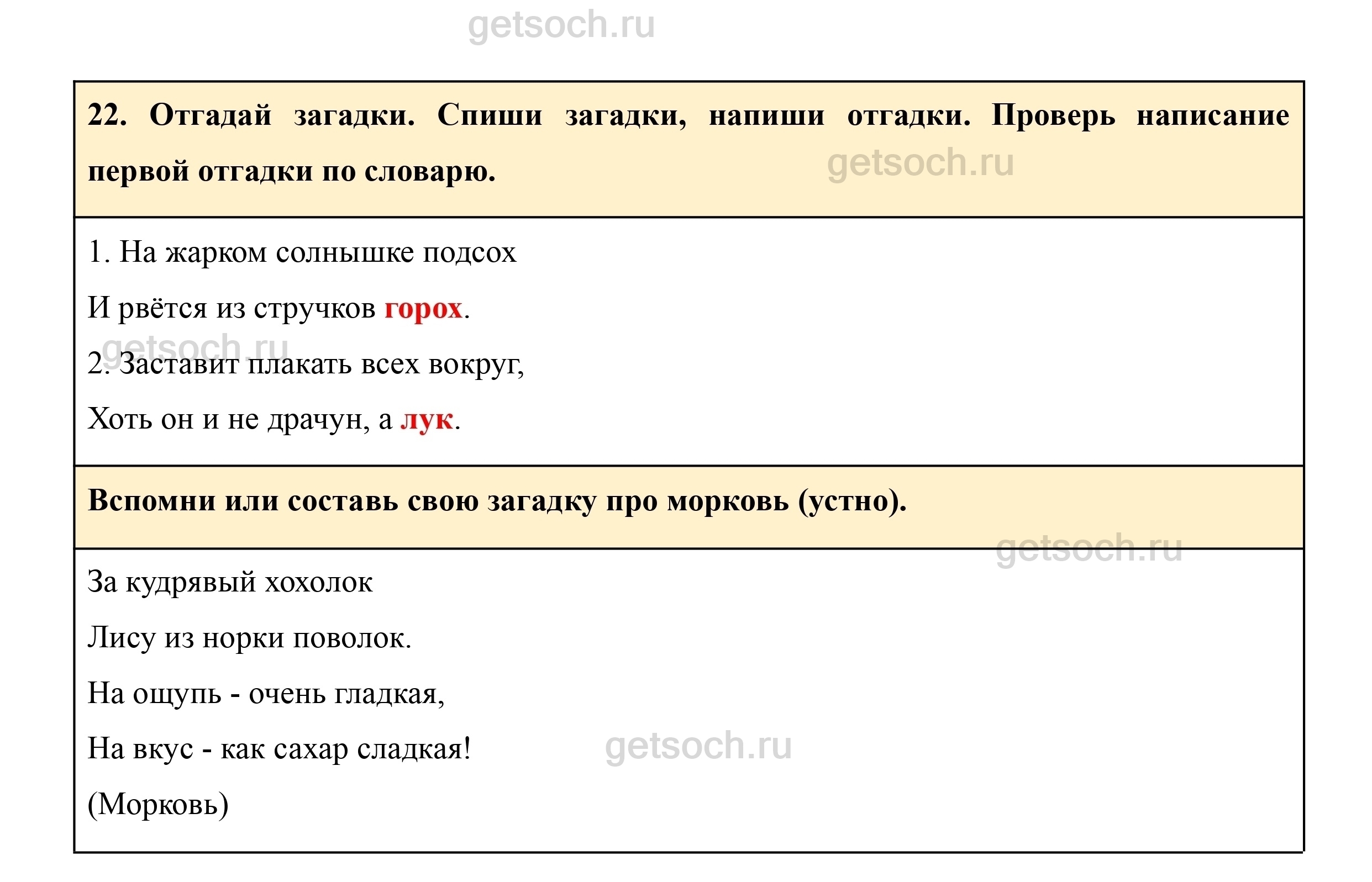 22. Отгадай загадки. Спиши загадки, напиши отгадки. Проверь написание первой отгадки по словарю. Вспомни или составь свою загадку про морковь (устно).