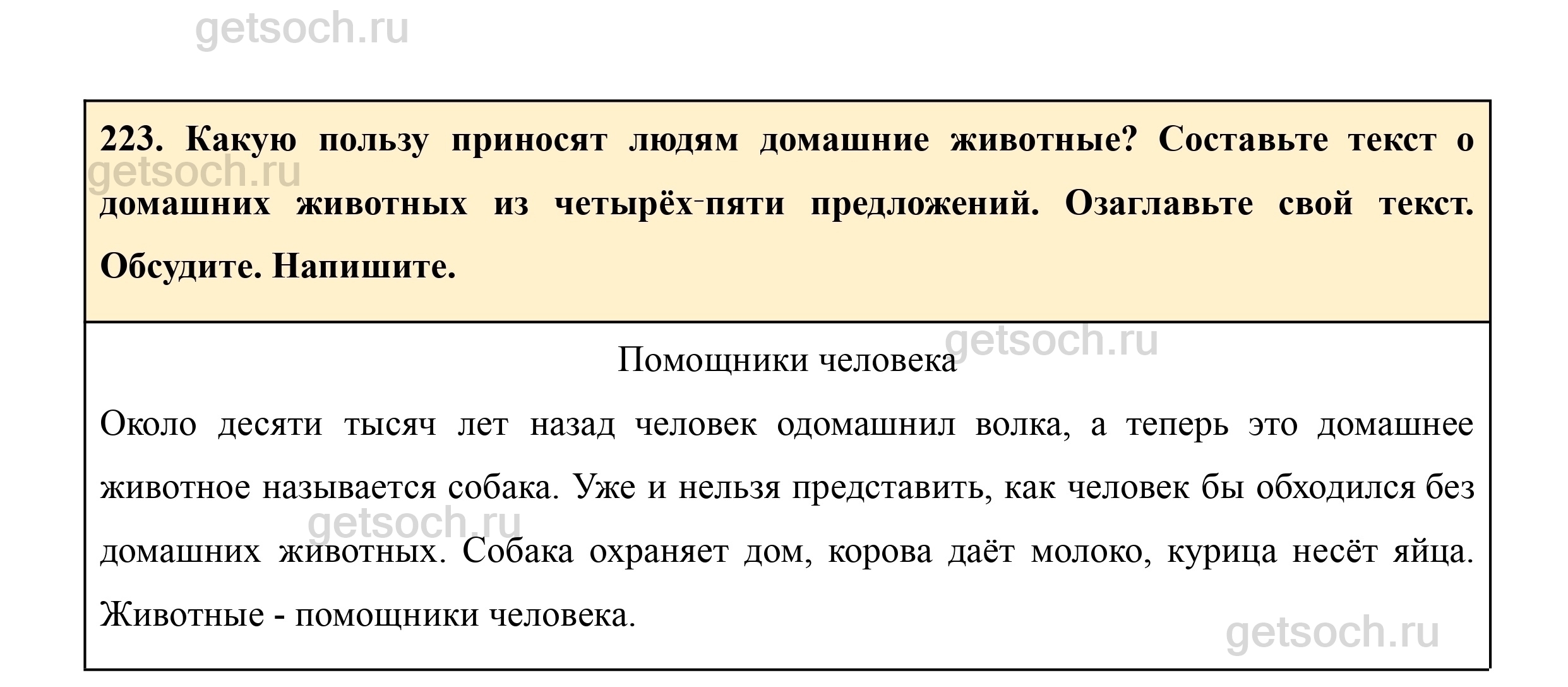 223. Какую пользу приносят людям домашние животные? Составьте текст о домашних животных из четырёх‑пяти предложений. Озаглавьте свой текст. Обсудите. Напишите.