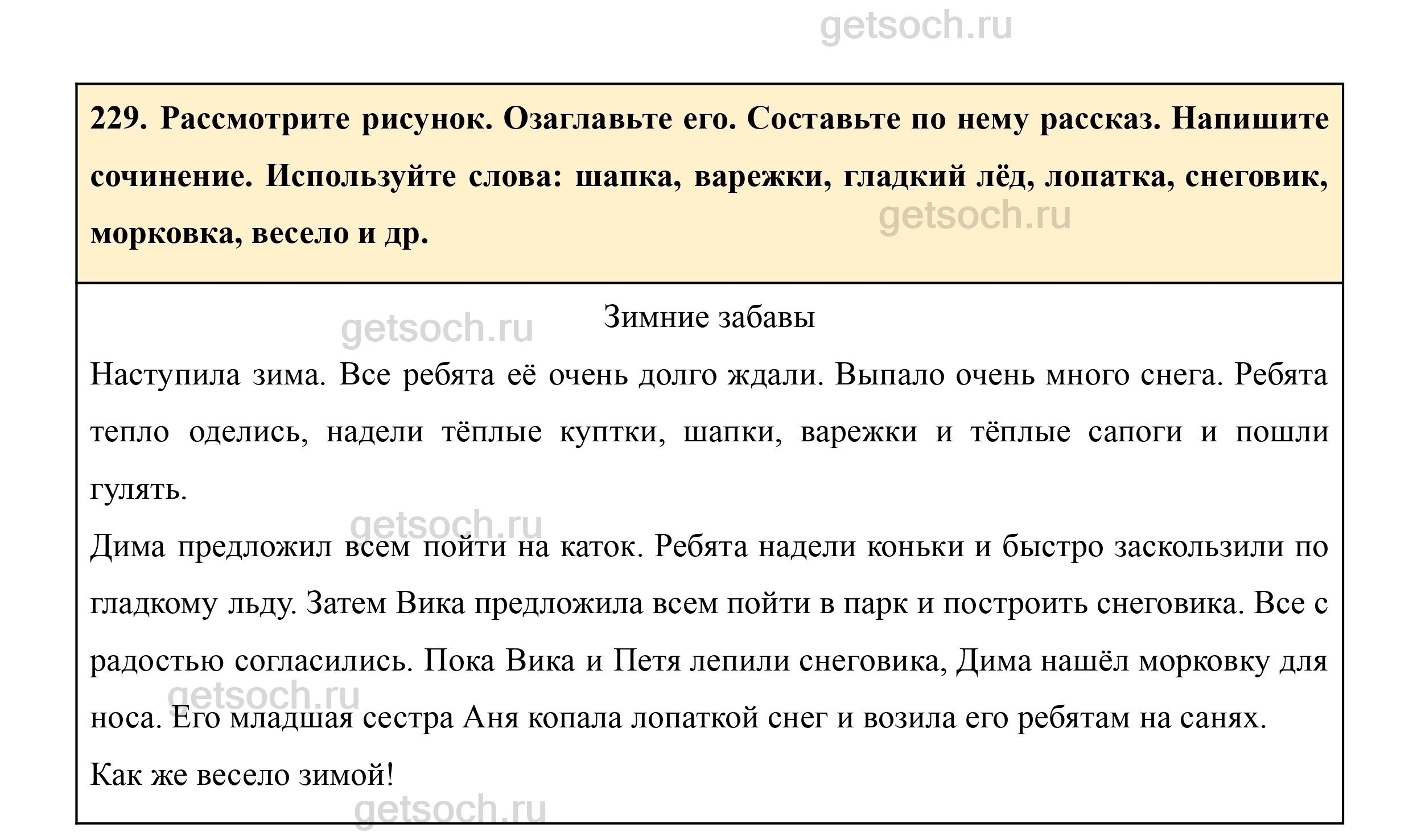 229. Рассмотрите рисунок. Озаглавьте его. Составьте по нему рассказ. Напишите сочинение. Используйте слова: шапка, варежки, гладкий лёд, лопатка, снеговик, морковка, весело и др.