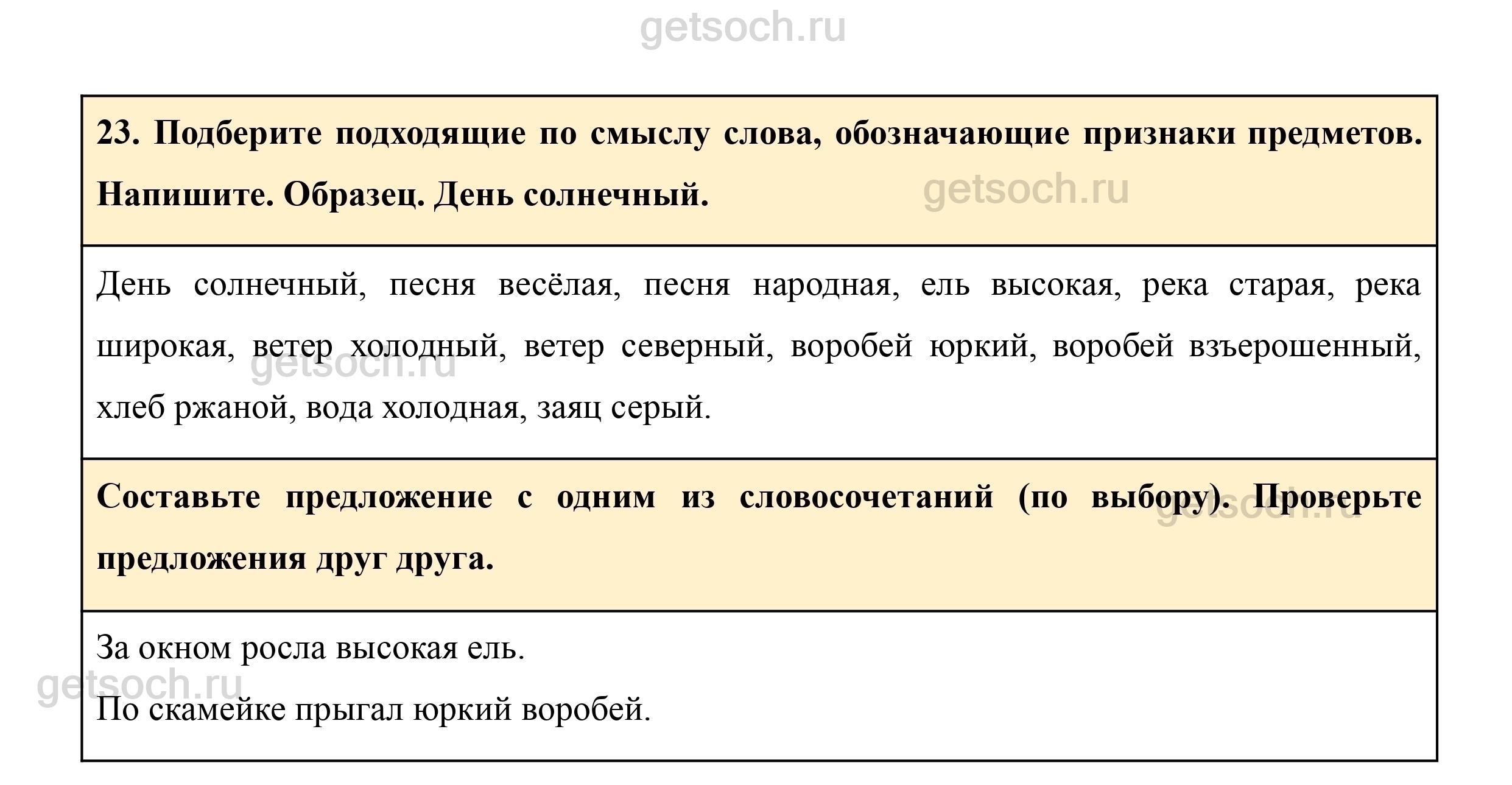 23. Подберите подходящие по смыслу слова, обозначающие признаки предметов. Напишите. Образец. День солнечный.