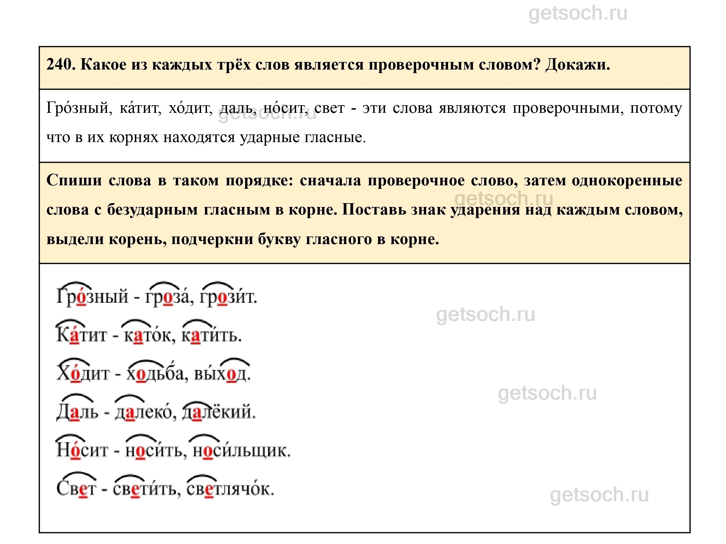 240. Какое из каждых трёх слов является проверочным словом? Докажи.