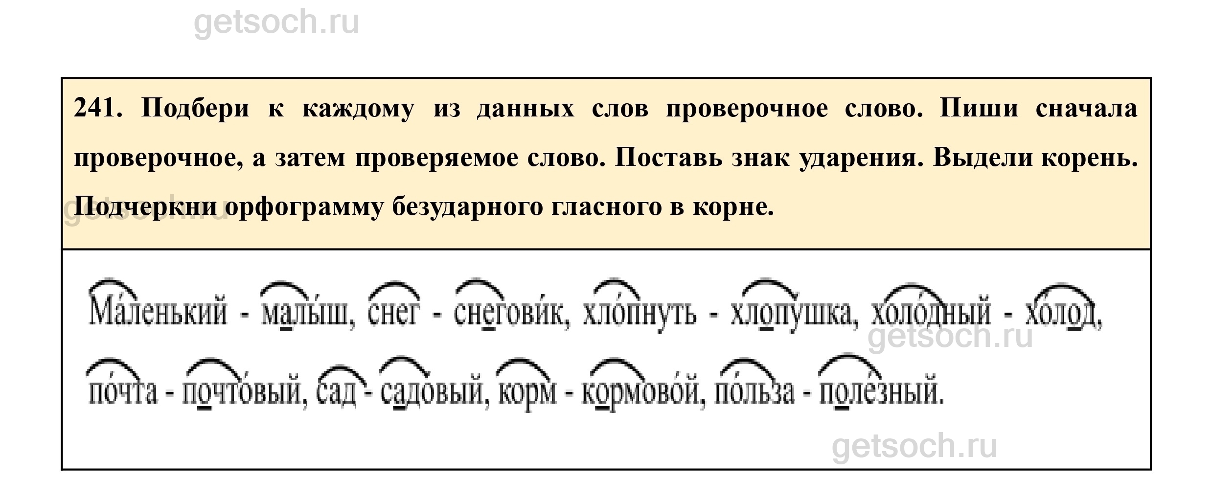 241. Подбери к каждому из данных слов проверочное слово. Пиши сначала проверочное, а затем проверяемое слово. Поставь знак ударения. Выдели корень. Подчеркни орфограмму безударного гласного в корне.