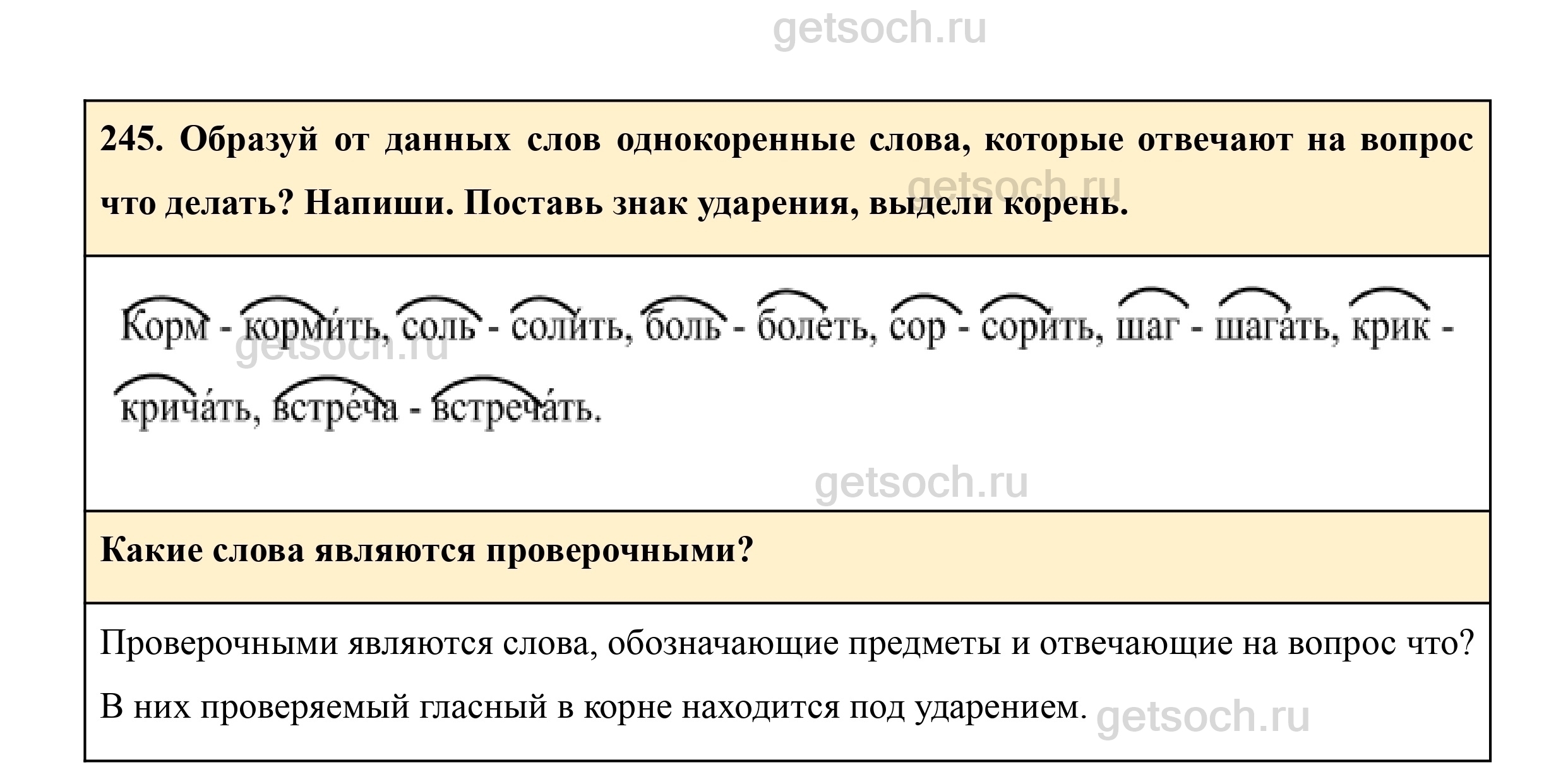 245. Образуй от данных слов однокоренные слова, которые отвечают на вопрос что делать? Напиши. Поставь знак ударения, выдели корень.