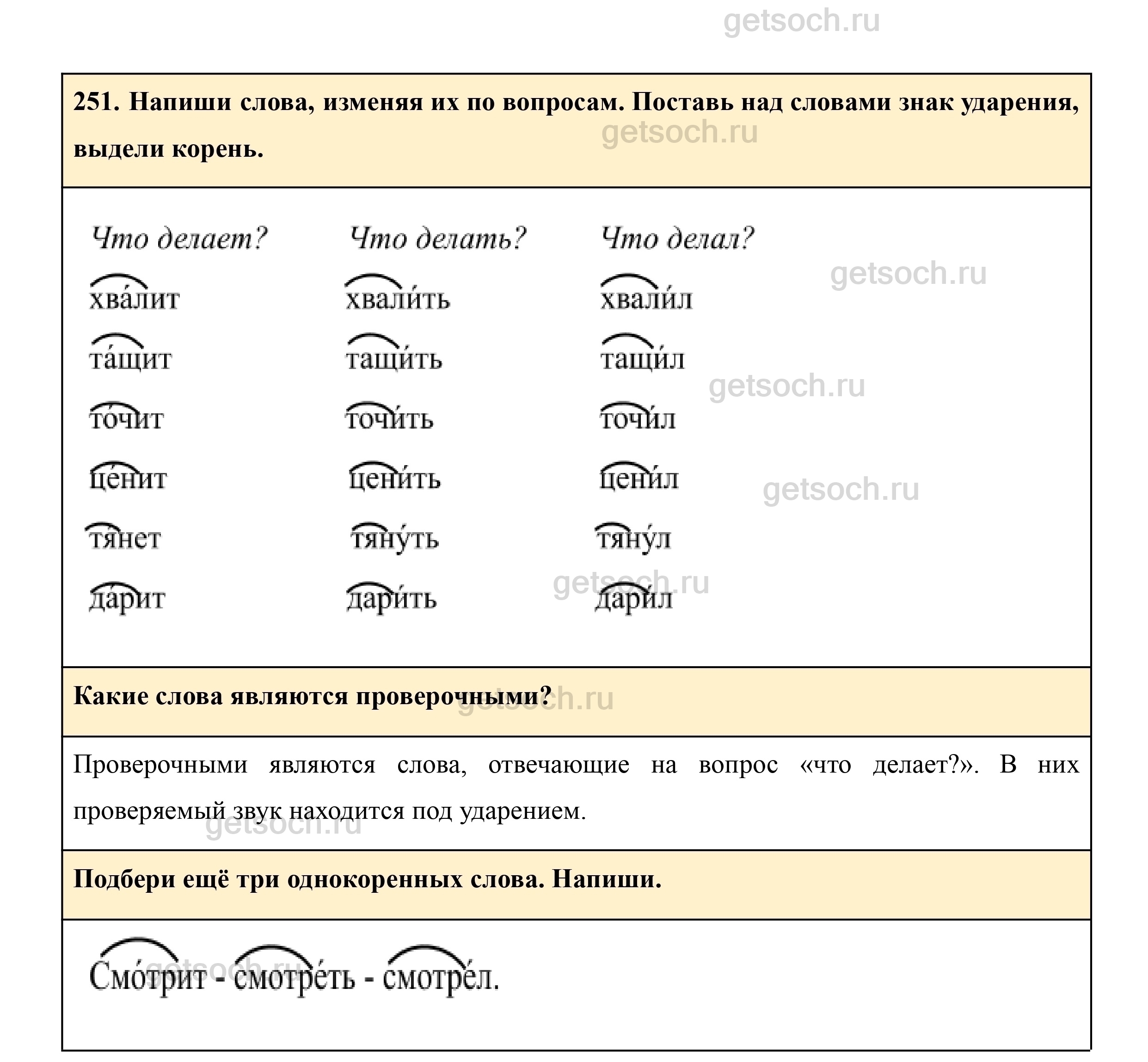 251. Напиши слова, изменяя их по вопросам. Поставь над словами знак ударения, выдели корень.