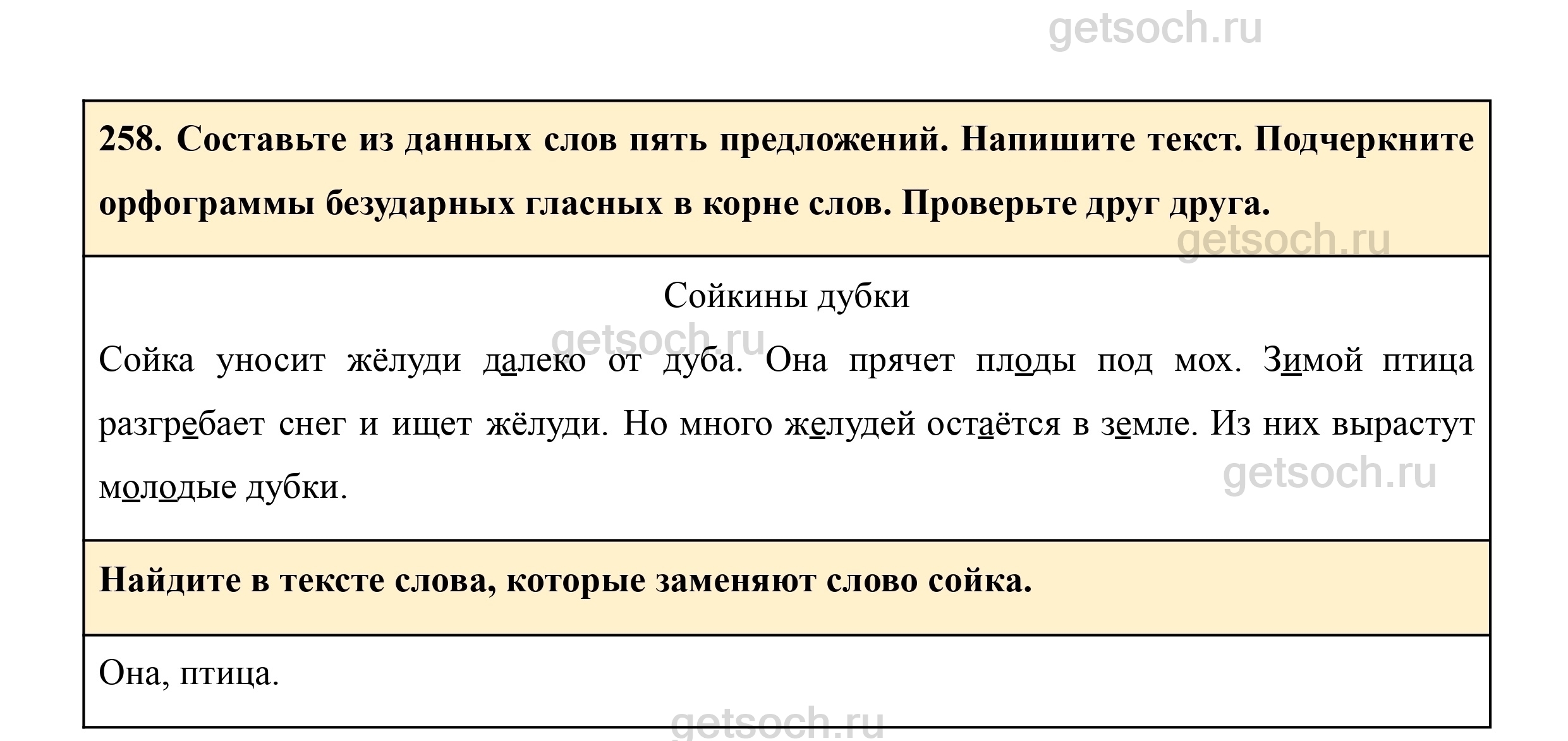258. Составьте из данных слов пять предложений. Напишите текст. Подчеркните орфограммы безударных гласных в корне слов. Проверьте друг друга.