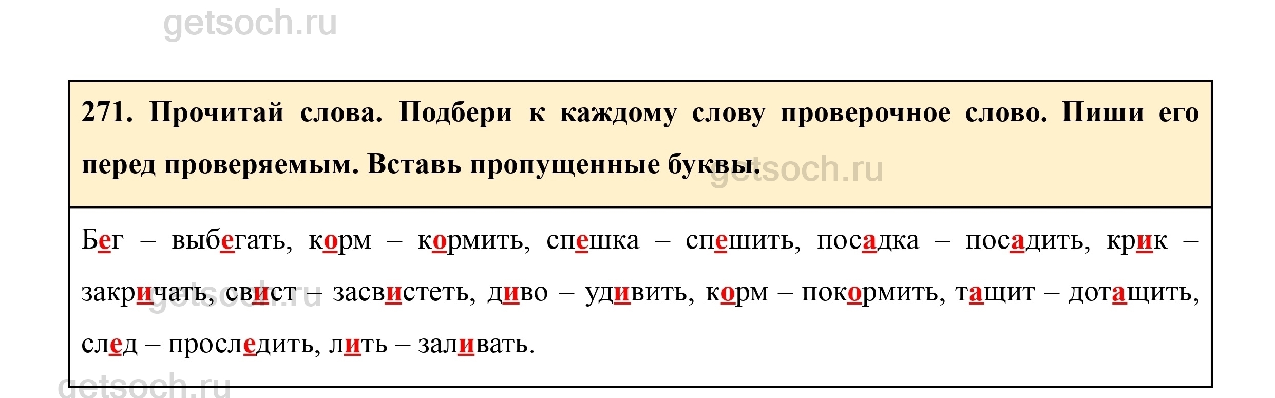 271. Прочитай слова. Подбери к каждому слову проверочное слово. Пиши его перед проверяемым. Вставь пропущенные буквы.