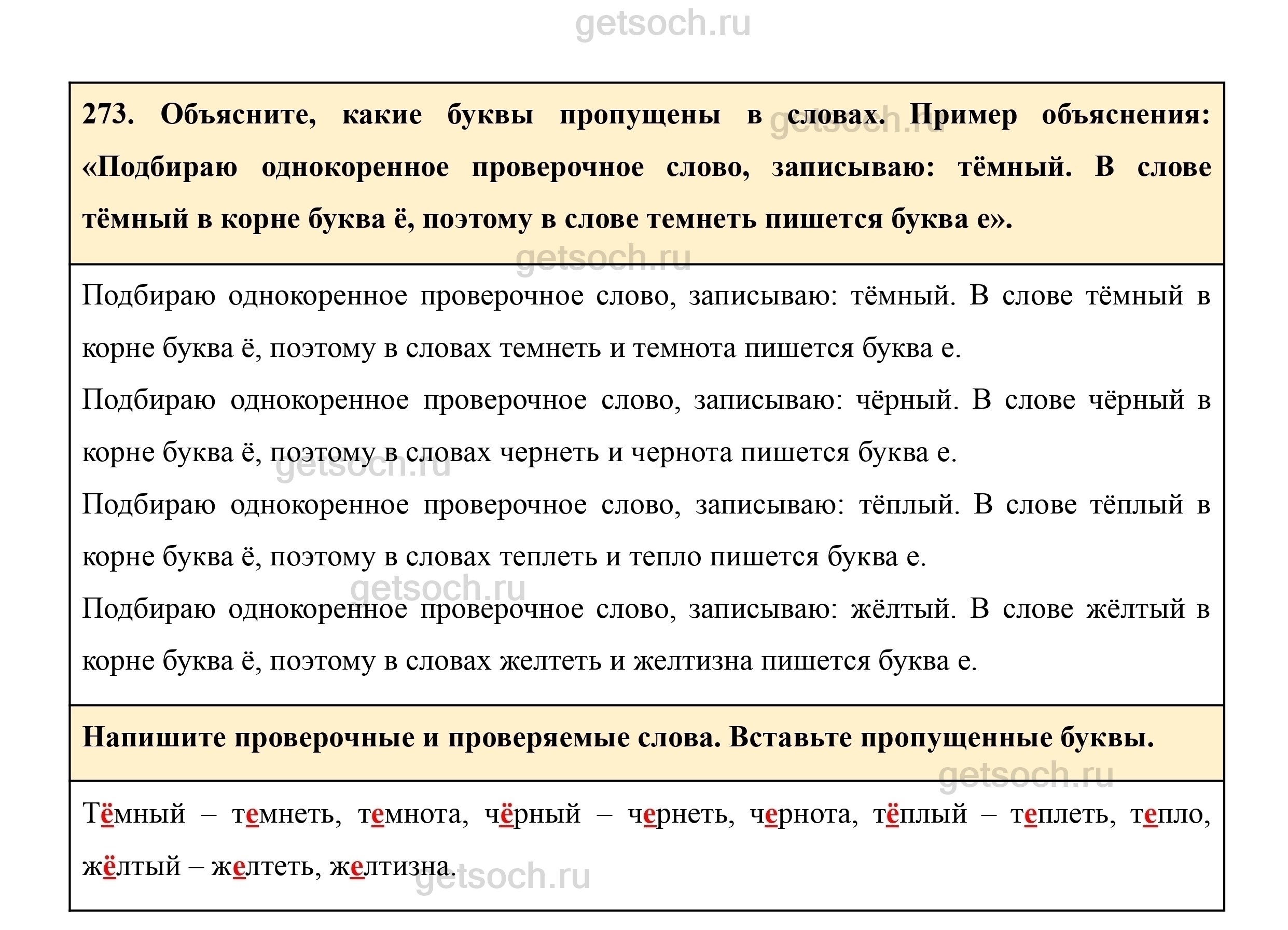 273. Объясните, какие буквы пропущены в словах. Пример объяснения: «Подбираю однокоренное проверочное слово, записываю: тёмный. В слове тёмный в корне буква ё, поэтому в слове темнеть пишется буква е».