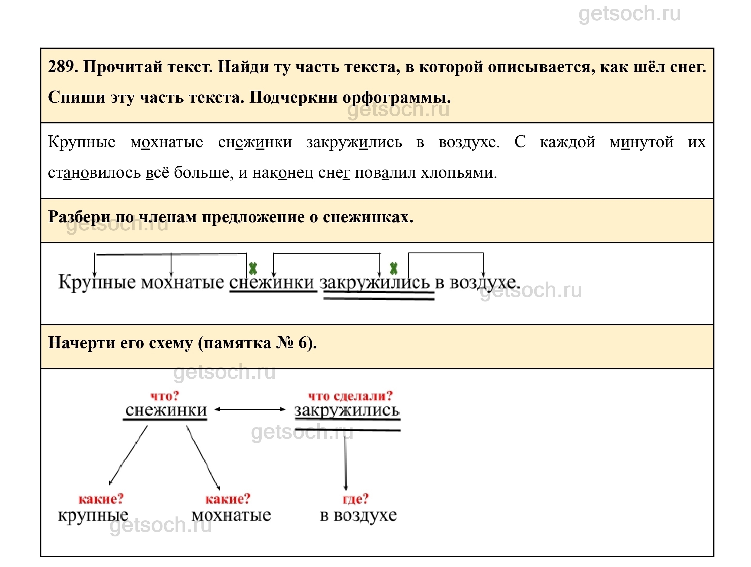 289. Прочитай текст. Найди ту часть текста, в которой описывается, как шёл снег. Спиши эту часть текста. Подчеркни орфограммы.