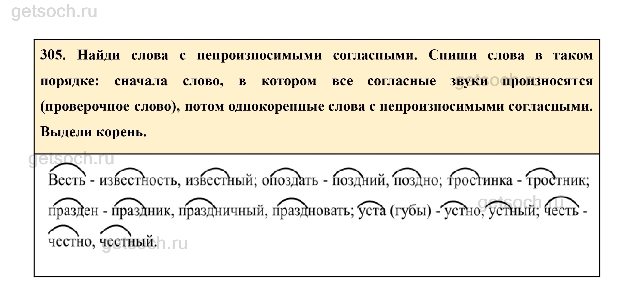 305. Найди слова с непроизносимыми согласными. Спиши слова в таком порядке: сначала слово, в котором все согласные звуки произносятся (проверочное слово), потом однокоренные слова с непроизносимыми согласными. Выдели корень.