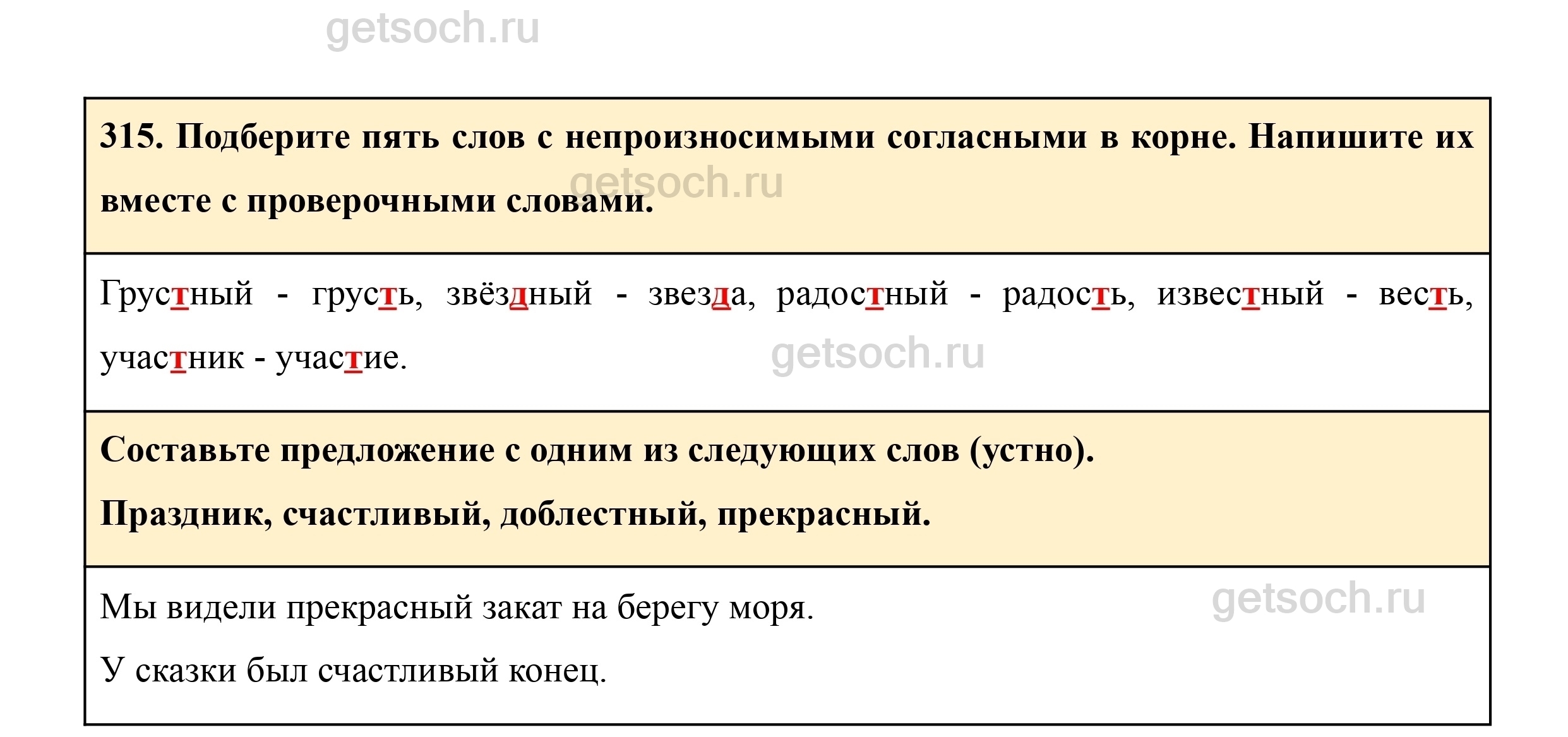 315. Подберите пять слов с непроизносимыми согласными в корне. Напишите их вместе с проверочными словами.