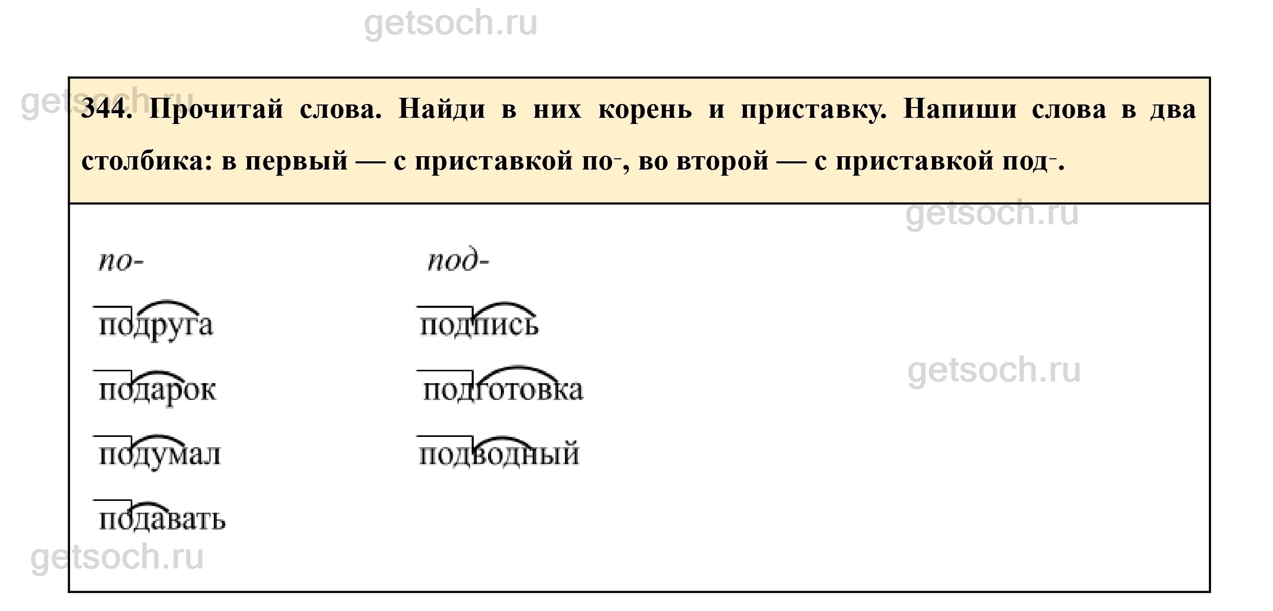 344. Прочитай слова. Найди в них корень и приставку. Напиши слова в два столбика: в первый — с приставкой по‑, во второй — с приставкой под‑.