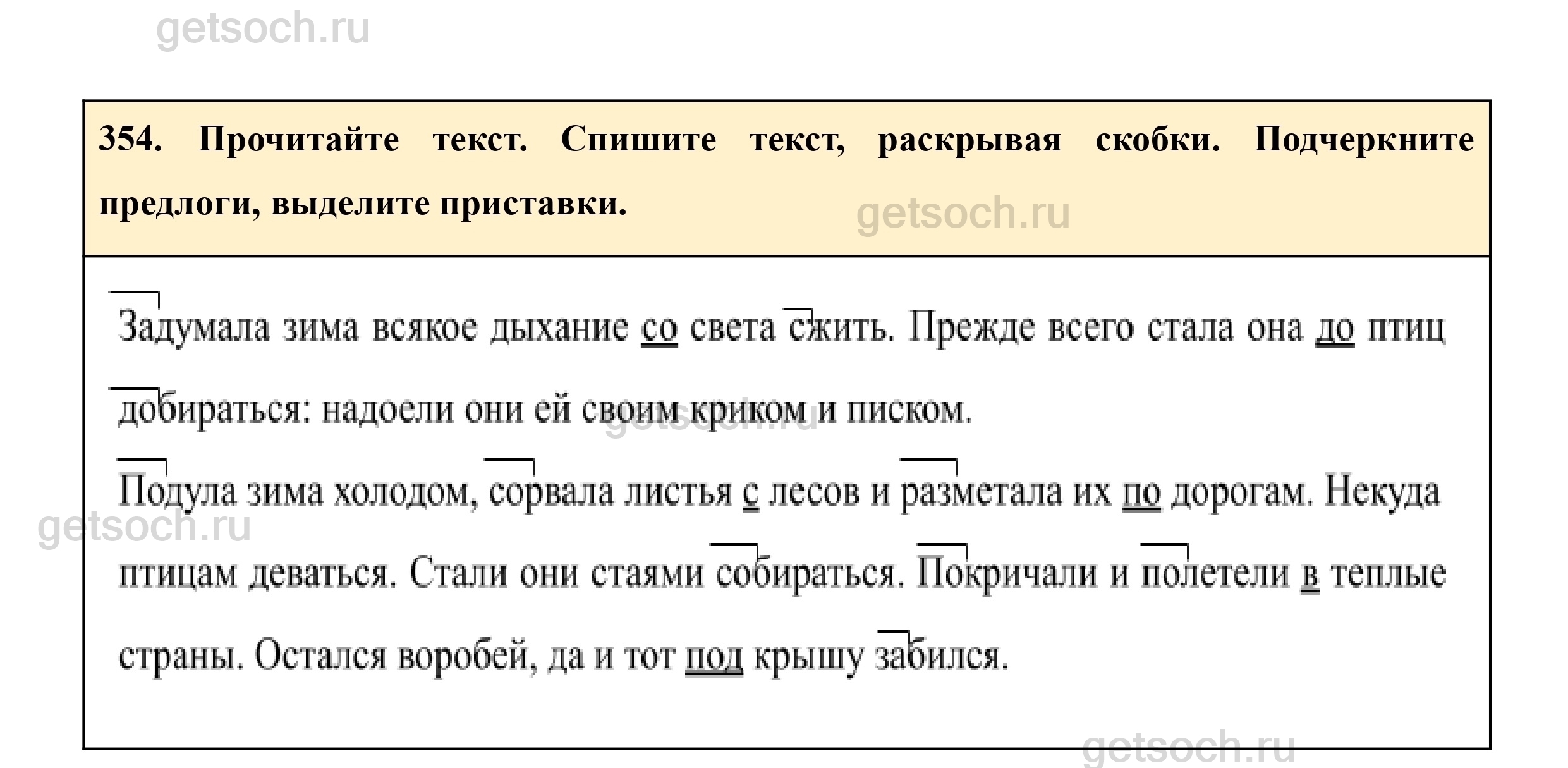 354. Прочитайте текст. Спишите текст, раскрывая скобки. Подчеркните предлоги, выделите приставки.