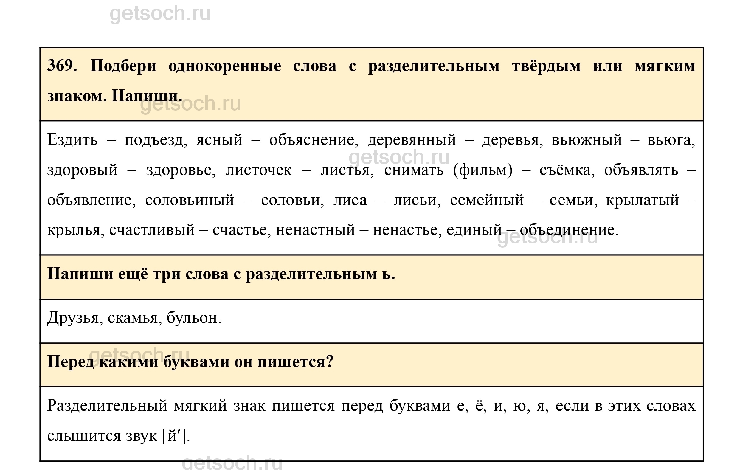 369. Подбери однокоренные слова с разделительным твёрдым или мягким знаком. Напиши.