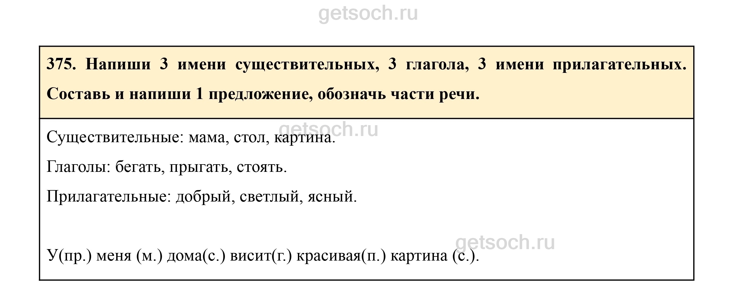 375. Напиши 3 имени существительных, 3 глагола, 3 имени прилагательных. Составь и напиши 1 предложение, обозначь части речи.