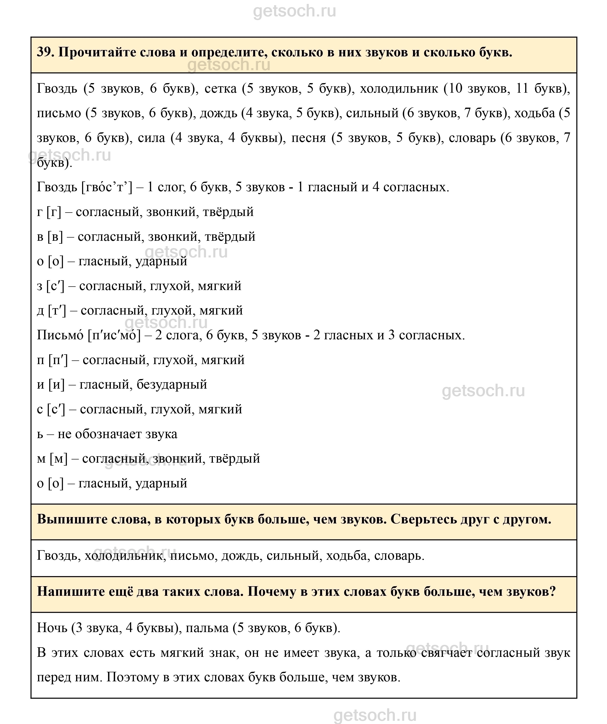 39. Прочитайте слова и определите, сколько в них звуков и сколько букв.