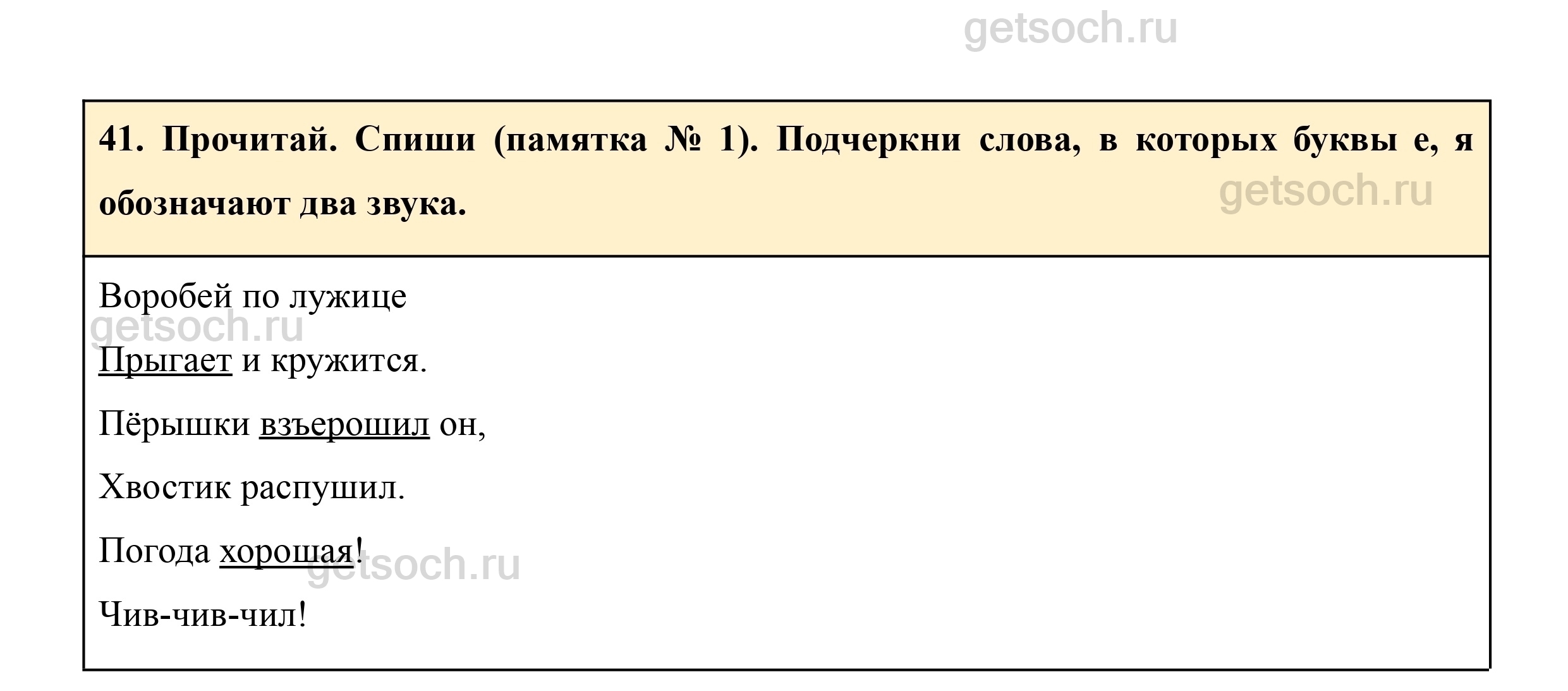 41. Прочитай. Спиши (памятка № 1). Подчеркни слова, в которых буквы е, я обозначают два звука.