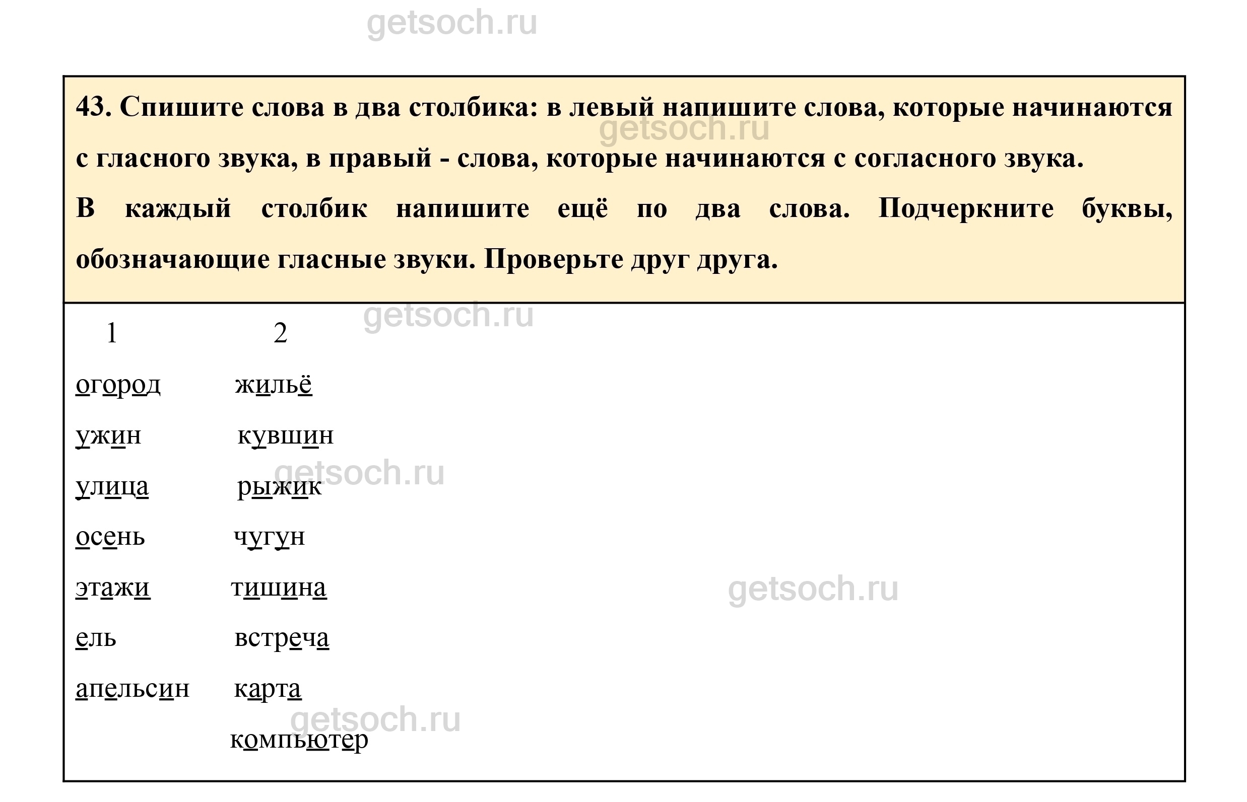 43. Спишите слова в два столбика: в левый напишите слова, которые начинаются с гласного звука, в правый – слова, которые начинаются с согласного звука.